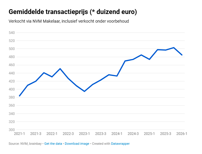 Er zijn gemiddeld minder bezichtigingen per woning en kopers krijgen meer tijd voor hun beslissing. Tegelijk is nog altijd sprake van schaarste, omdat de vraag groter blijft dan het aanbod. De gemiddelde verkoopprijs van bestaande woningen komt uit op €485.000. Dat is 2,7% lager dan in het vorige kwartaal. Een prijsdaling in het eerste kwartaal is gebruikelijk, maar is dit keer sterker dan in voorgaande jaren. Op jaarbasis is nog steeds sprake van een lichte stijging met €10.000.