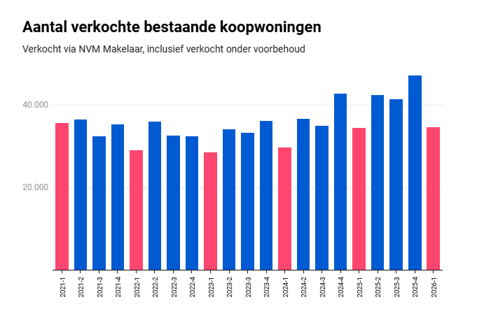 In het eerste kwartaal van 2026 zijn circa 34.600 bestaande woningen verkocht via NVM Makelaars. Dat is 27% minder dan in het voorgaande kwartaal en een sterkere daling dan gebruikelijk in deze periode. Naast een winterseizoenseffect, waardoor vanwege sneeuw en ijzel de fotografie en bezichtigingen werden uitgesteld, spelen meerdere factoren een rol: de hypotheekrente is eind 2025 licht gestegen, het consumentenvertrouwen is gedaald en internationale ontwikkelingen zorgen voor onzekerheid. Hierdoor stellen kopers hun aankoop vaker uit en nemen zij minder risico. Regionaal zijn er duidelijke verschillen zichtbaar. In ongeveer de helft van de regio’s ligt het aantal verkopen lager dan een jaar geleden, met name in het westen en noorden. In delen van het oosten en zuiden is juist sprake van groei, vaak in regio’s waar het aanbod sterker is toegenomen.