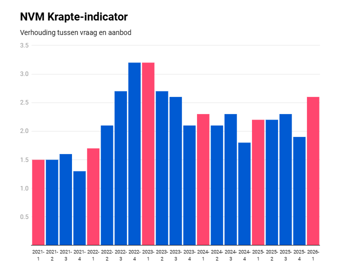 Het aantal woningen in aanbod stijgt in het eerste kwartaal licht tot bijna 30.000 en ligt ruim 20% hoger dan een jaar geleden. De toename van het aanbod komt vooral doordat woningen minder snel worden verkocht. Hierdoor neemt de krapte op de markt af en loopt de NVM krapte-indicator op naar 2,6. Ondanks deze ontwikkeling blijft de woningmarkt krap. In veel regio’s worden woningen nog altijd snel verkocht en is de vraag groter dan het aanbod. Goutsmits-Gerssen: “De verschillen op de woningmarkt nemen hierdoor toe. Instapklare en energiezuinige woningen blijven populair, terwijl andere woningen langer te koop staan. Dat geeft kopers meer keuze, maar maakt het speelveld ook uitdagender.”