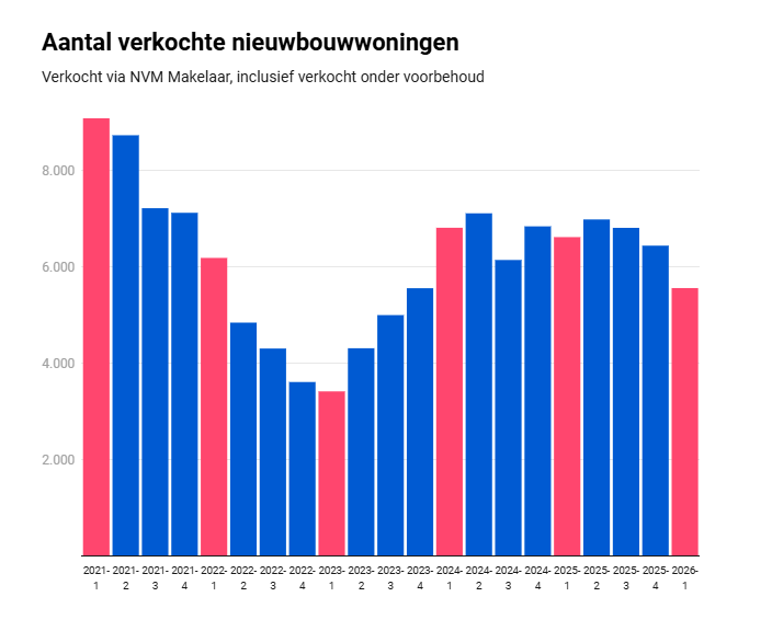 De nieuwbouwmarkt laat een gemengd beeld zien. In het eerste kwartaal van 2026 zijn circa 5.600 nieuwbouwwoningen verkocht, ruim duizend minder dan een jaar eerder. Tegelijkertijd groeit het aanbod sterk naar circa 18.200 woningen, het hoogste niveau sinds 2016. Ook de aanwas van nieuw aanbod neemt toe: bijna 7.700 woningen zijn in verkoop genomen, een stijging van 8% ten opzichte van een jaar eerder.