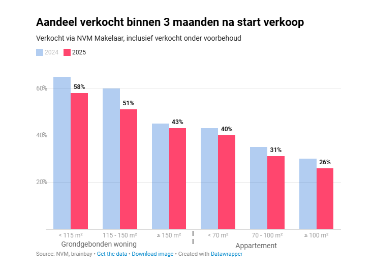 Samen met onzekerheid over financiering en woonlasten komt de verkoop van projecten moeilijker op gang en blijven woningen gemiddeld langer in verkoop staan. Daarbij daalt het aandeel woningen dat binnen drie maanden wordt verkocht. Door deze lagere verkoopsnelheid neemt de dynamiek in de nieuwbouwmarkt af. Grondgebonden woningen verkopen nog relatief snel, terwijl appartementen langer in verkoop blijven. Dit hangt samen met het grote aanbod van appartementen en een minder goede aansluiting op de vraag.