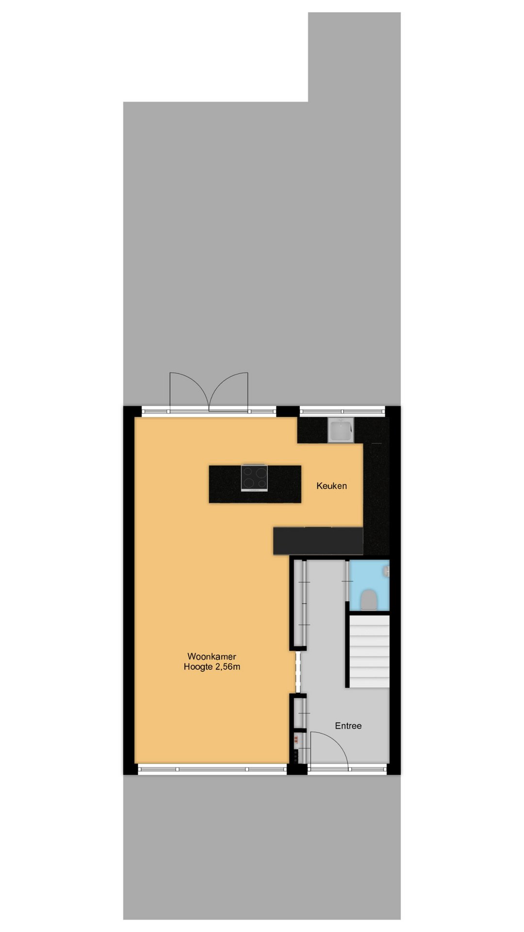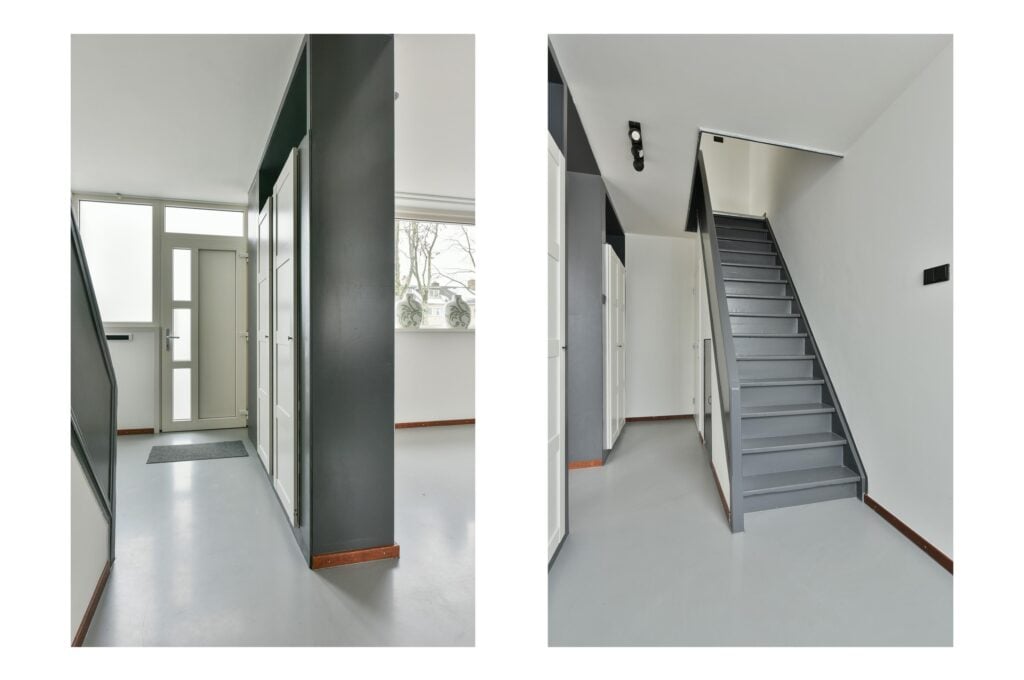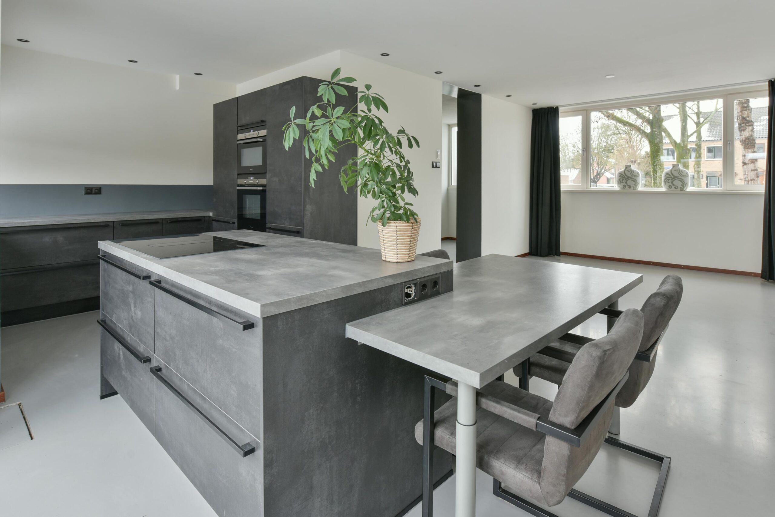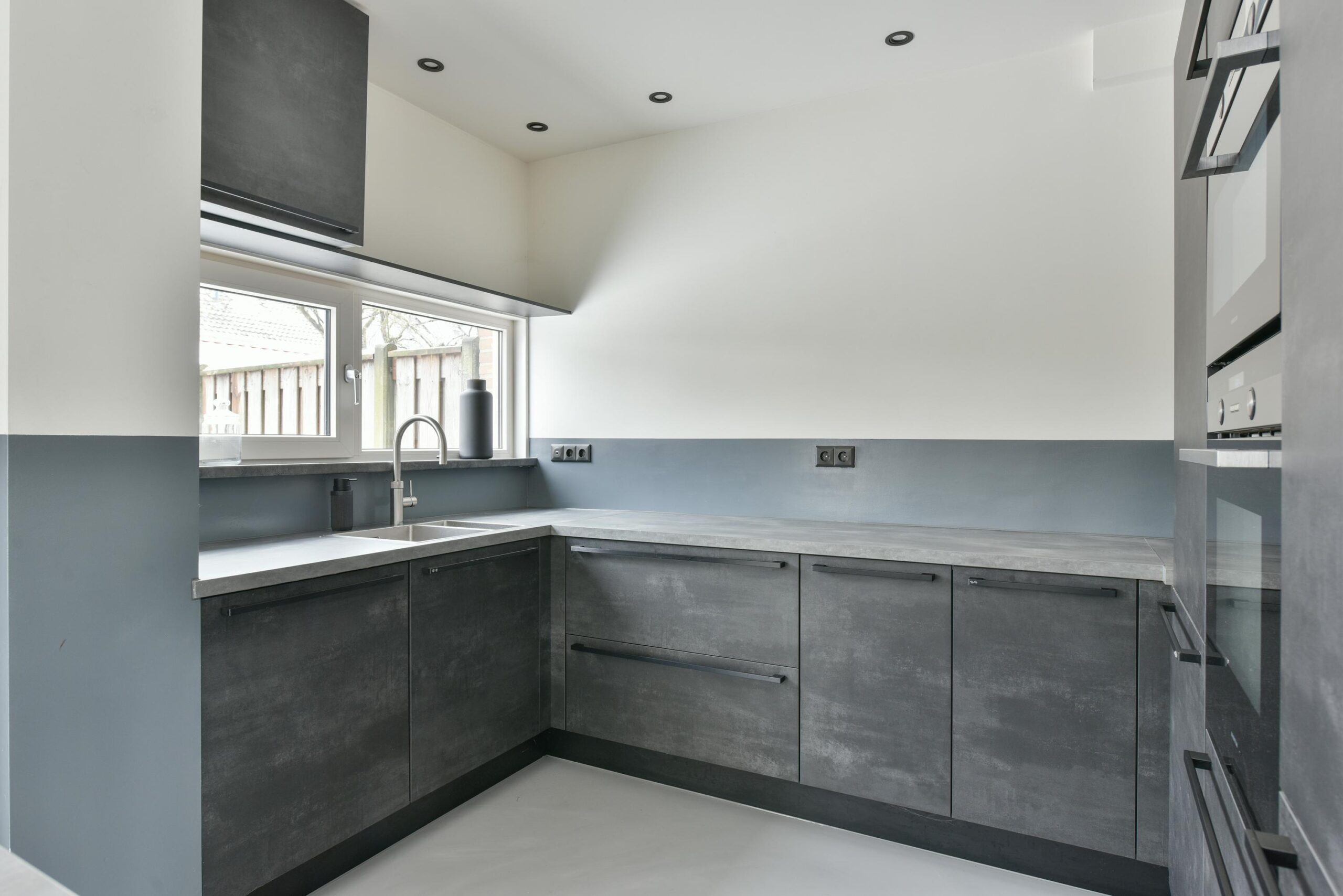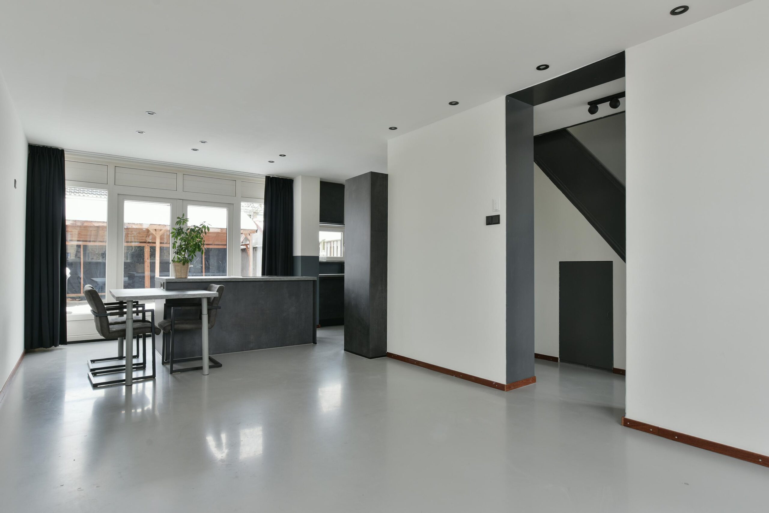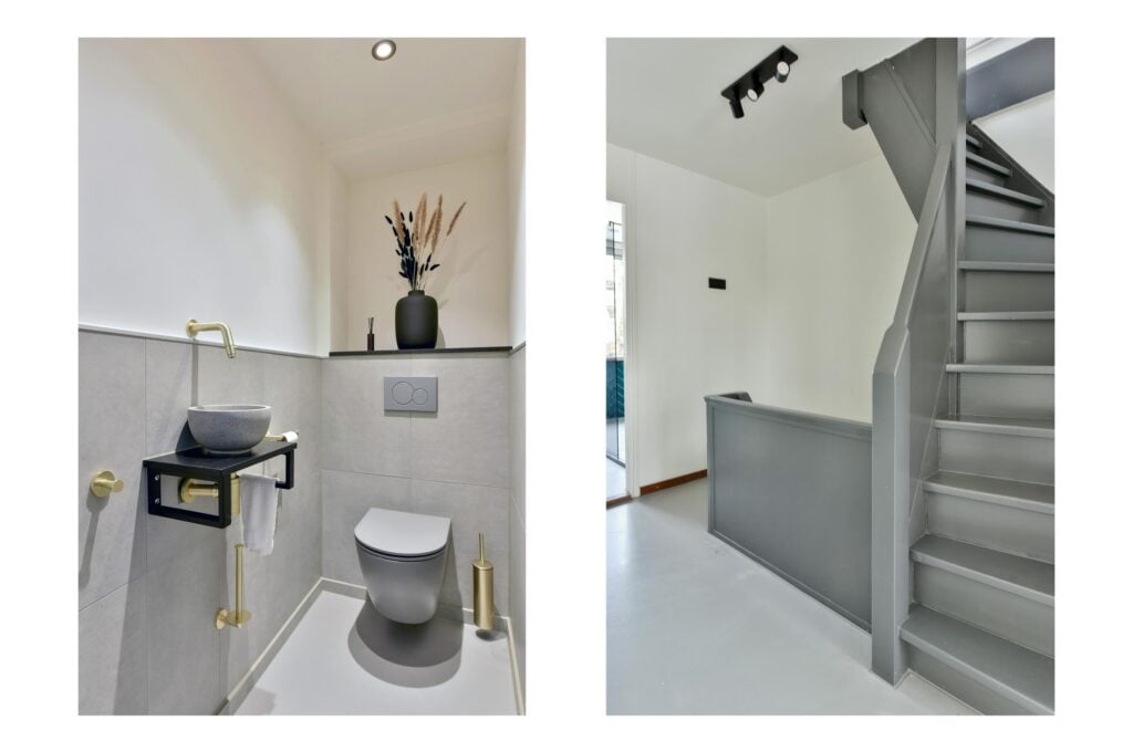 Via the entrance you reach a spacious and well-kept hallway with a large wardrobe closet, the meter cupboard, staircase to the first floor, a practical under-stairs storage cupboard and a luxury, fully renovated toilet room. From the hallway you enter the front-to-back living room (windows at both front and rear) with luxury open-plan kitchen. This floor is finished with a high-quality cast floor and is directly connected to the rear garden through French doors. The open kitchen is arranged in a modern layout and features a cooking island. It is equipped with, among other things, a Quooker, oven, combi microwave, dishwasher, a large refrigerator and a large freezer. An integrated dining table is also incorporated in the kitchen, which can easily be removed if desired. The entire ground floor is fitted with underfloor heating.