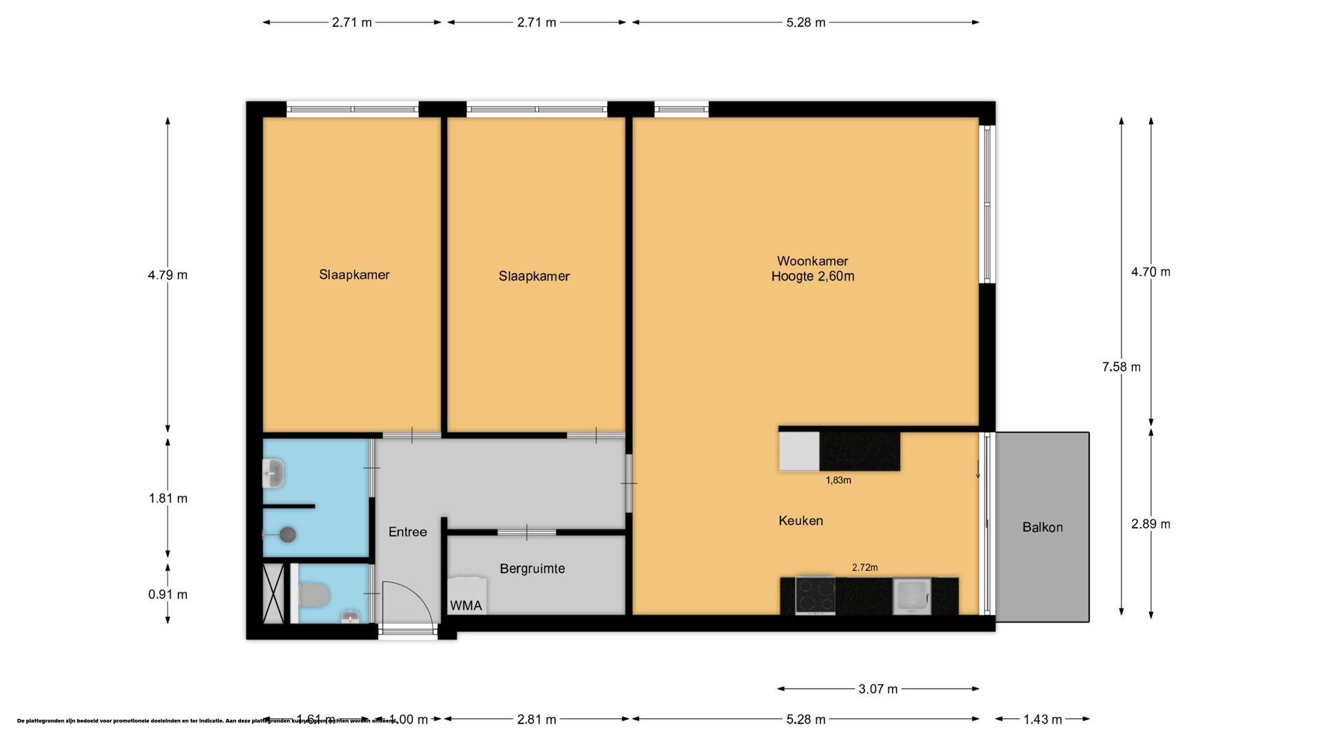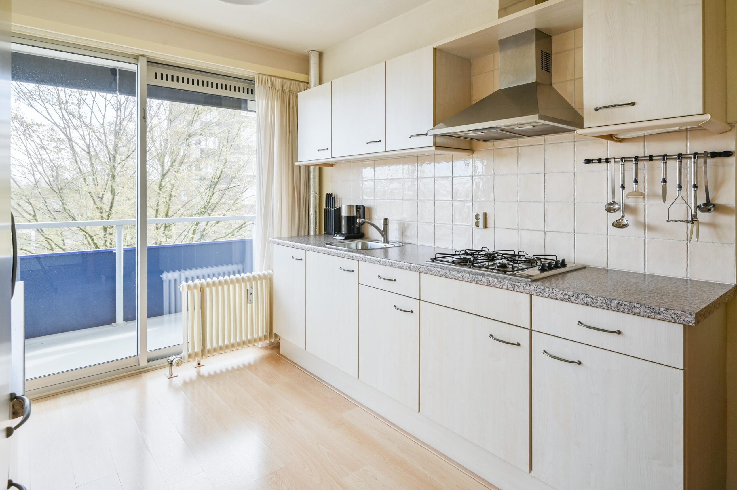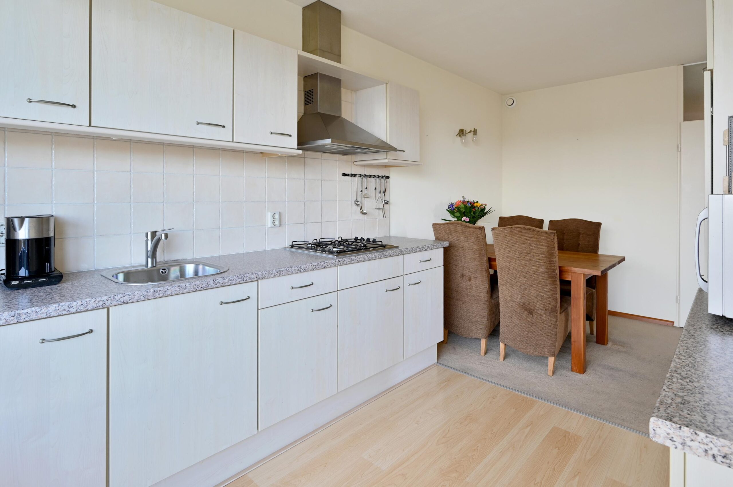 De keuken is functioneel en grenst aan het balkon. Het appartement heeft 2 goede slaapkamers. Er is een grote inpandige berging met goede bergruimte en de aansluiting voor de wasapparatuur.