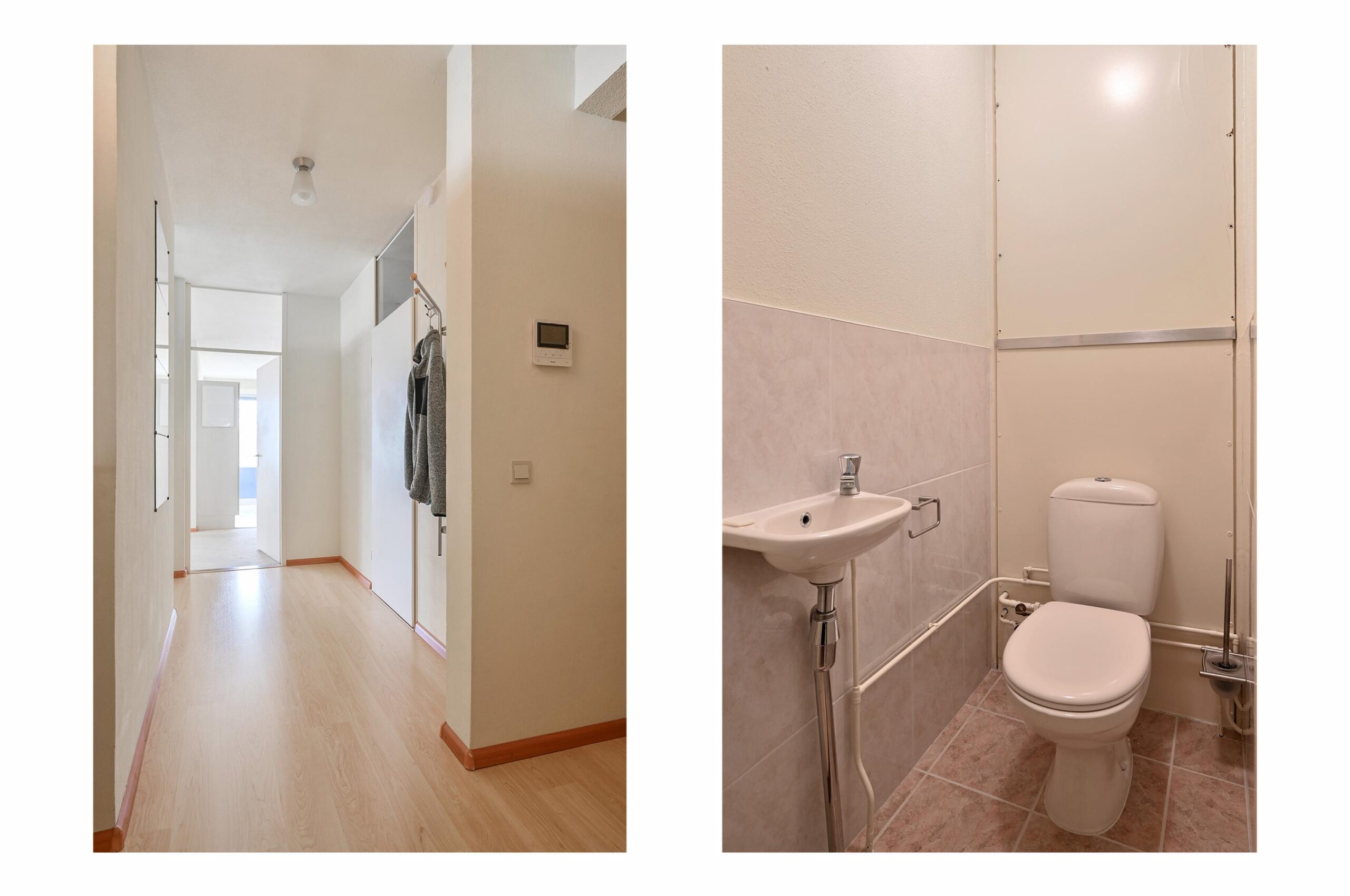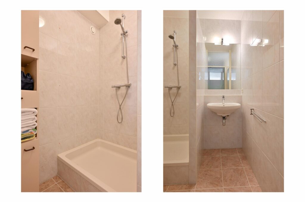 De badkamer is betegeld en heeft een douchehoek en een wastafel. De toilet is apart en vanuit de gang direct na de entree bereikbaar.