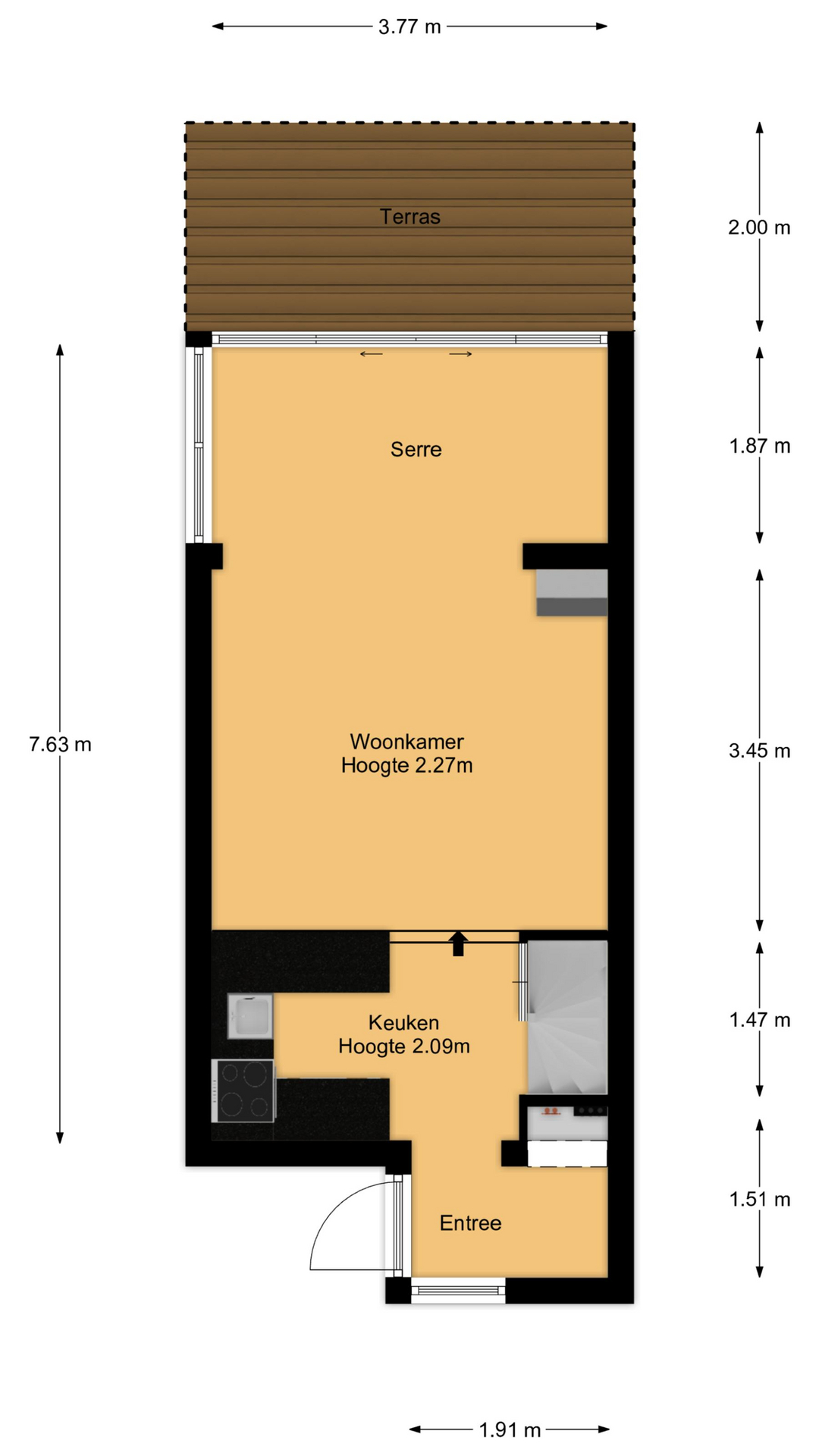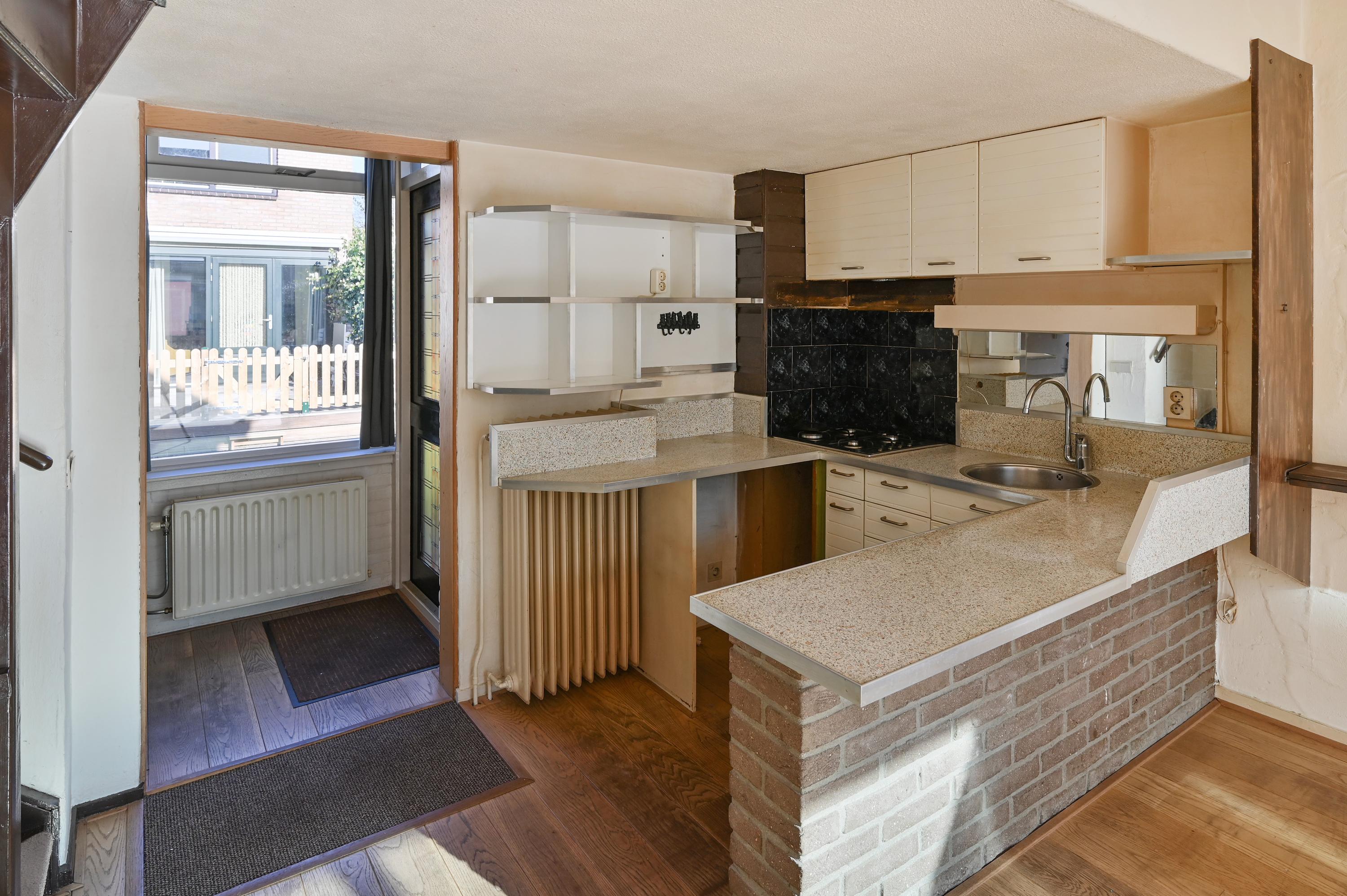 Via de uitgebouwde entree kom je in de hal. In deze hal is een bergkast/meterkast aanwezig. De keuken in U-vorm vormt de overgang naar de woonkamer. De eenvoudige keuken heeft enige apparatuur.