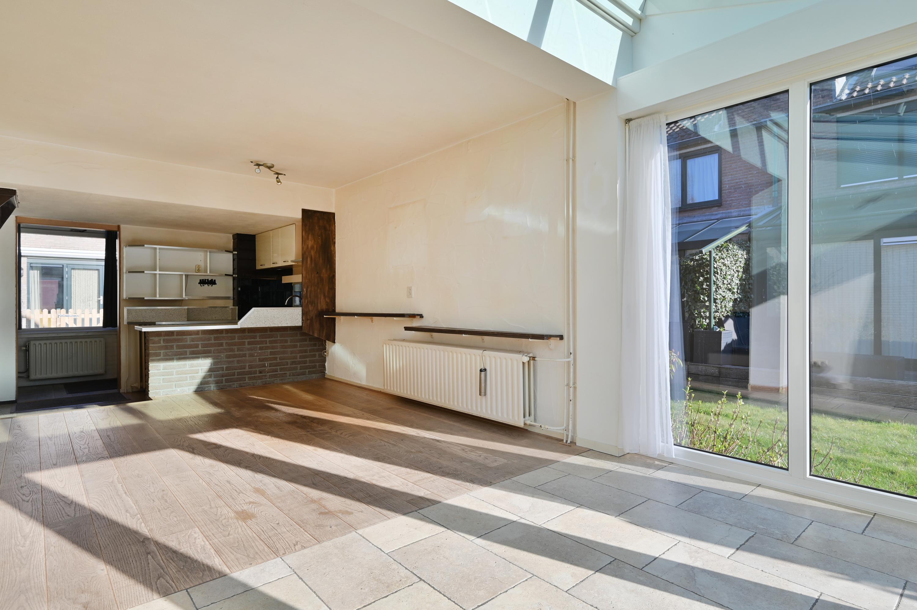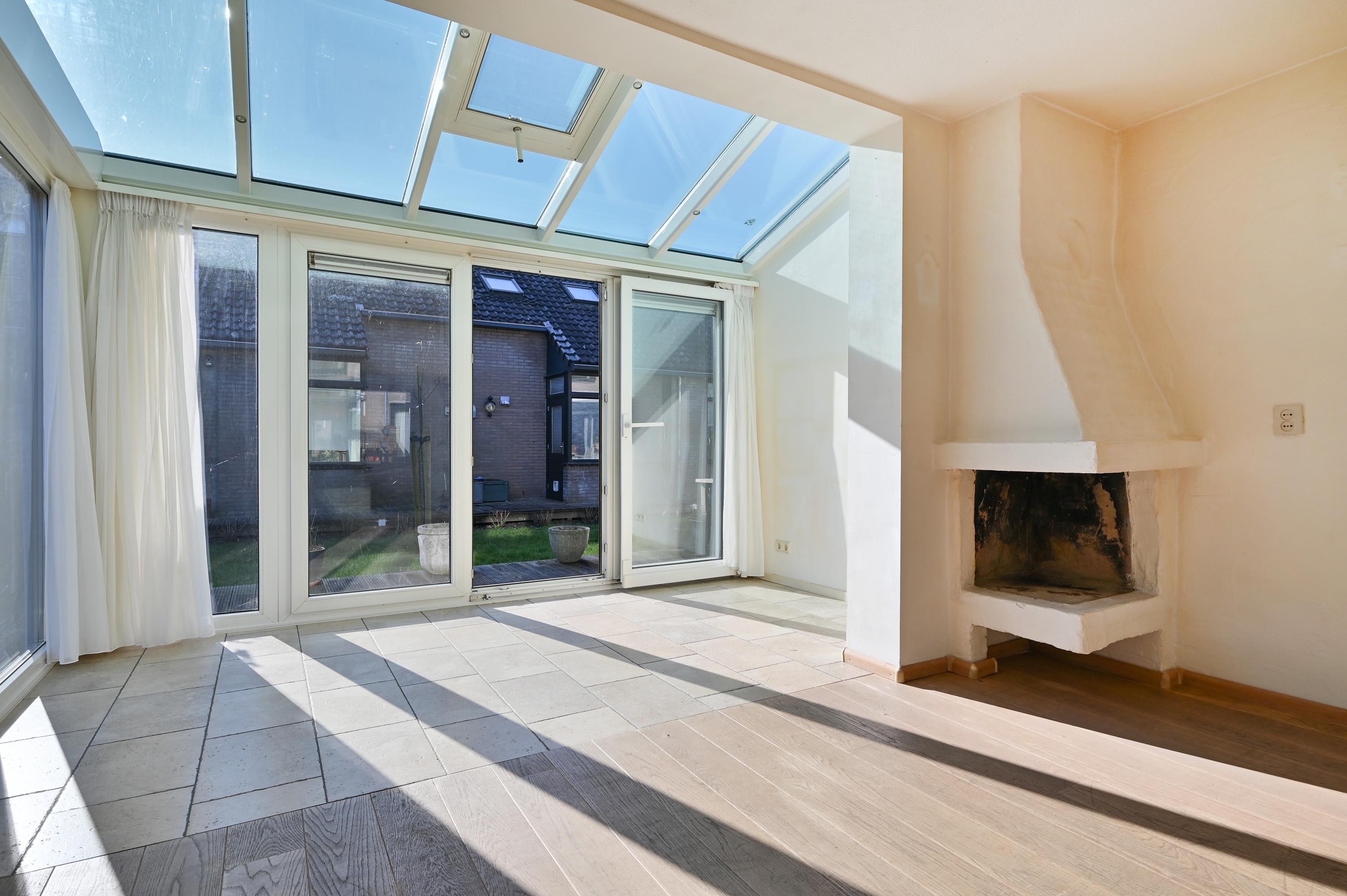 Via een kleine opstap kom je in de uitgebouwde woonkamer met een open haard. De aangebouwde serre (kunststof 2008 HR+ glas) geeft extra ruimte en is licht door het vele glas. De serre geeft toegang tot het onderheide terras, met ligging aan een gezamenlijk grasveld.
