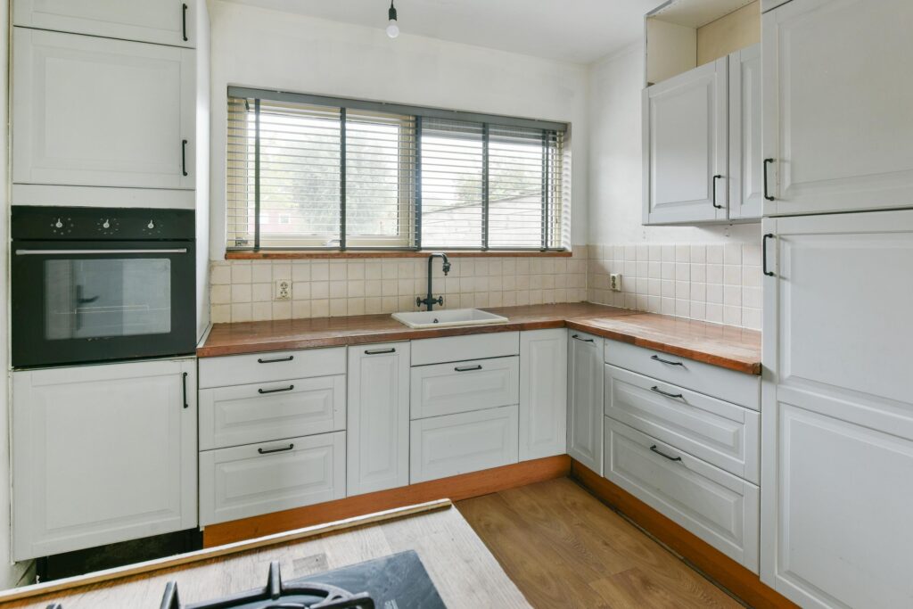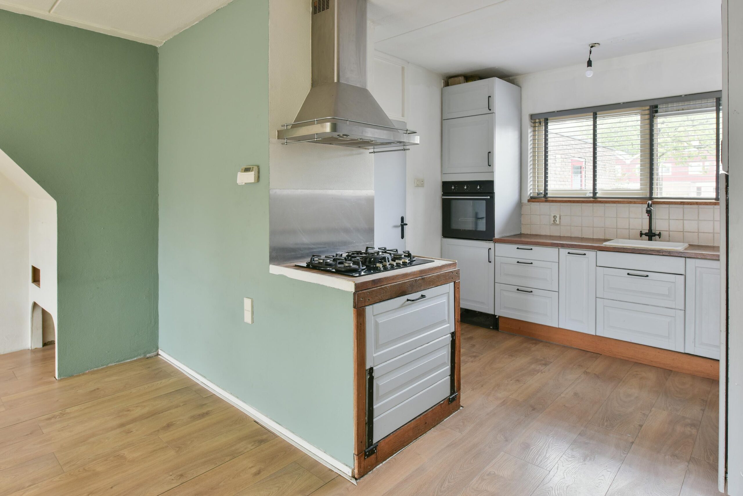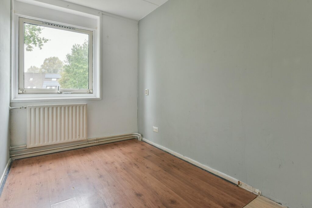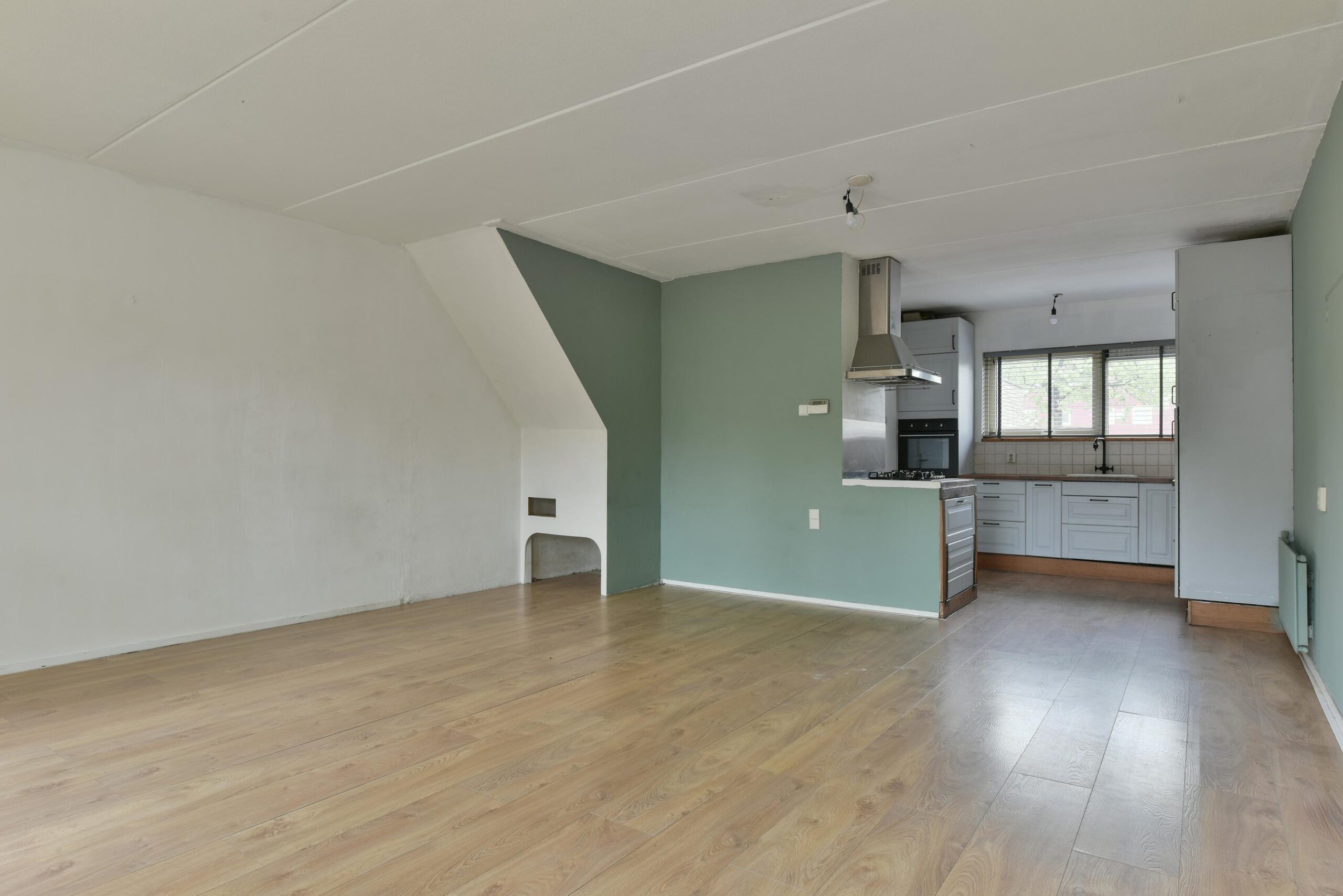 Ruime lichte woonkamer voorzien van trapkast en toegangsdeur naar de achtertuin. De woonkamer heeft een laminaatvloer. Aan de voorzijde van de woning bevindt zich open keuken, deze is voorzien van een eenvoudig inrichting.