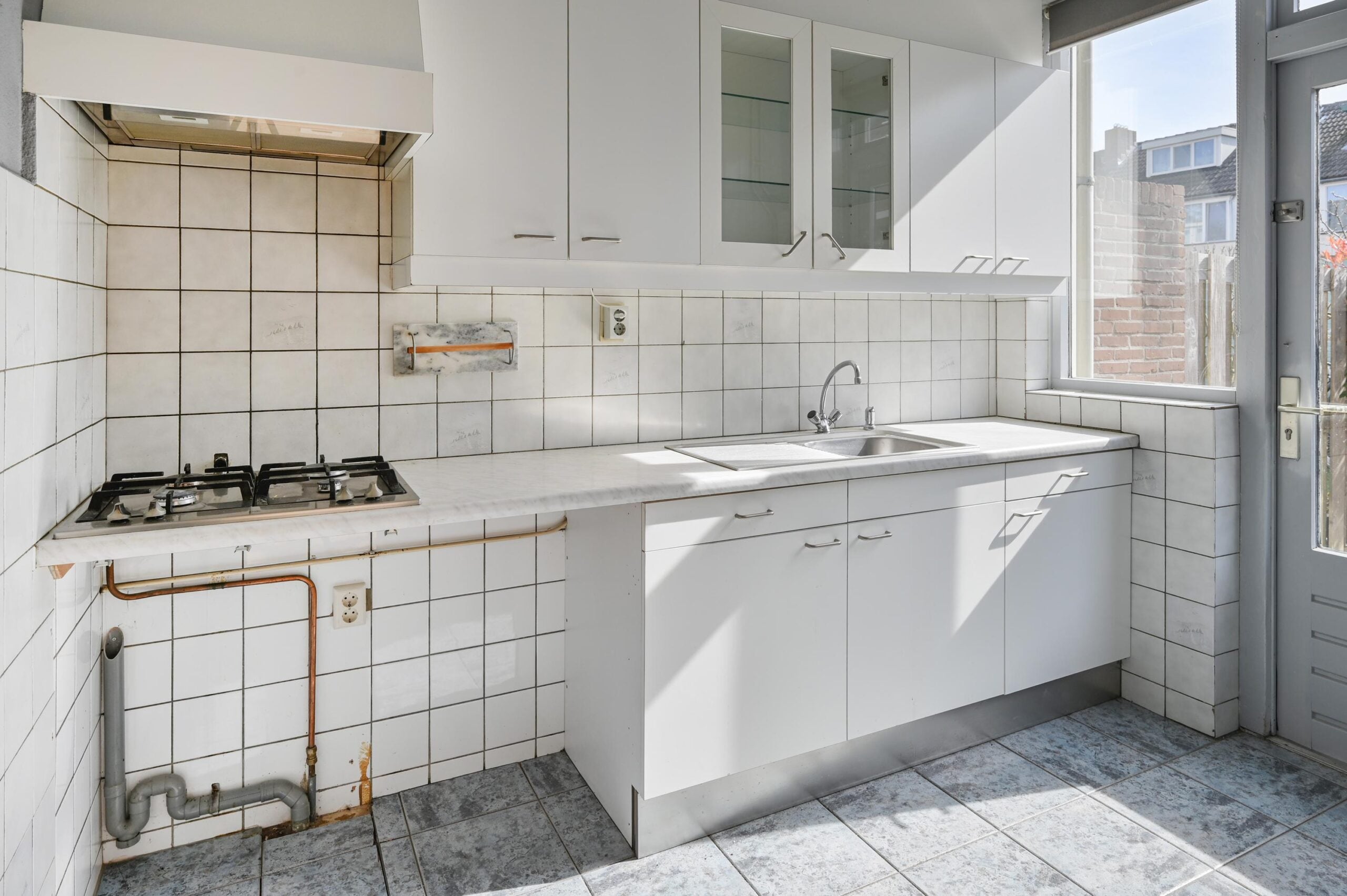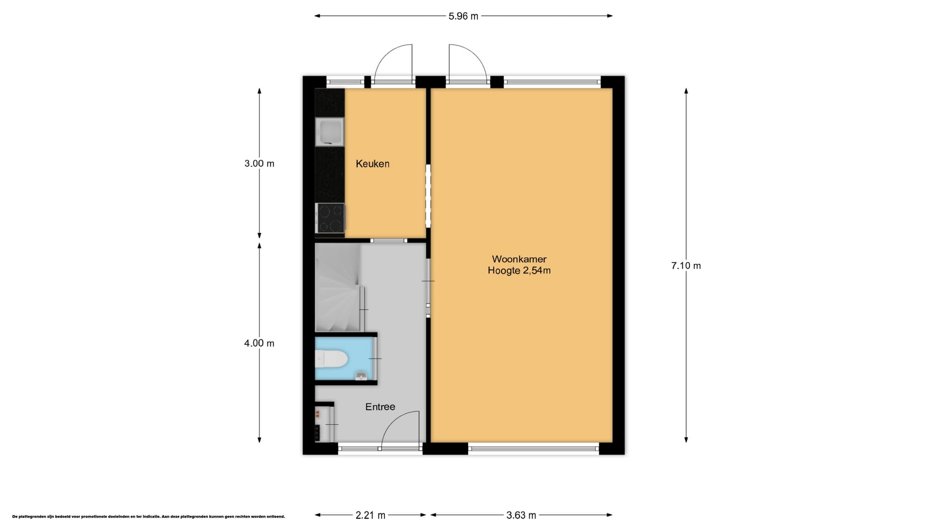 Entree met hal, toilet (voorzien van ventilator), trapkast en meterkast (6 groepen en glasvezelaansluiting). De lichte doorzonwoonkamer is voorzien van een laminaatvloer en geeft via een deur toegang tot de tuin. De half-open keuken is eenvoudig uitgevoerd met een 4-pits gaskookplaat en afzuigkap.