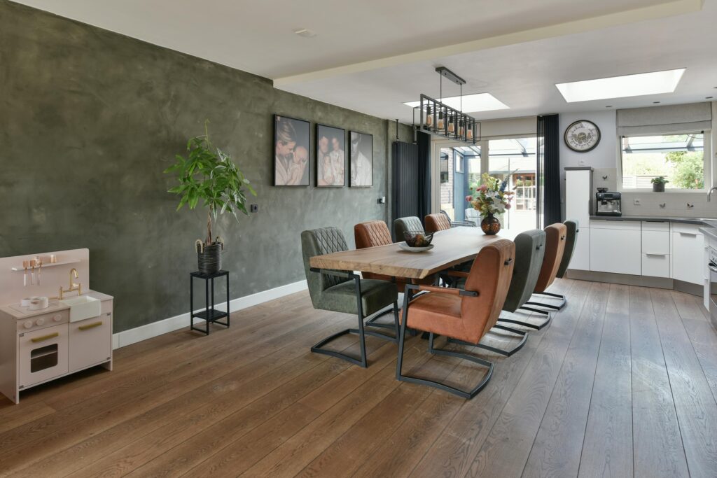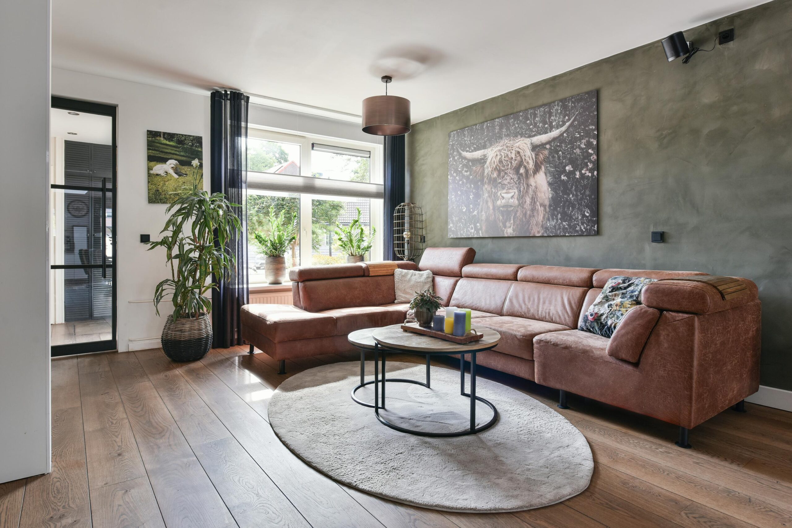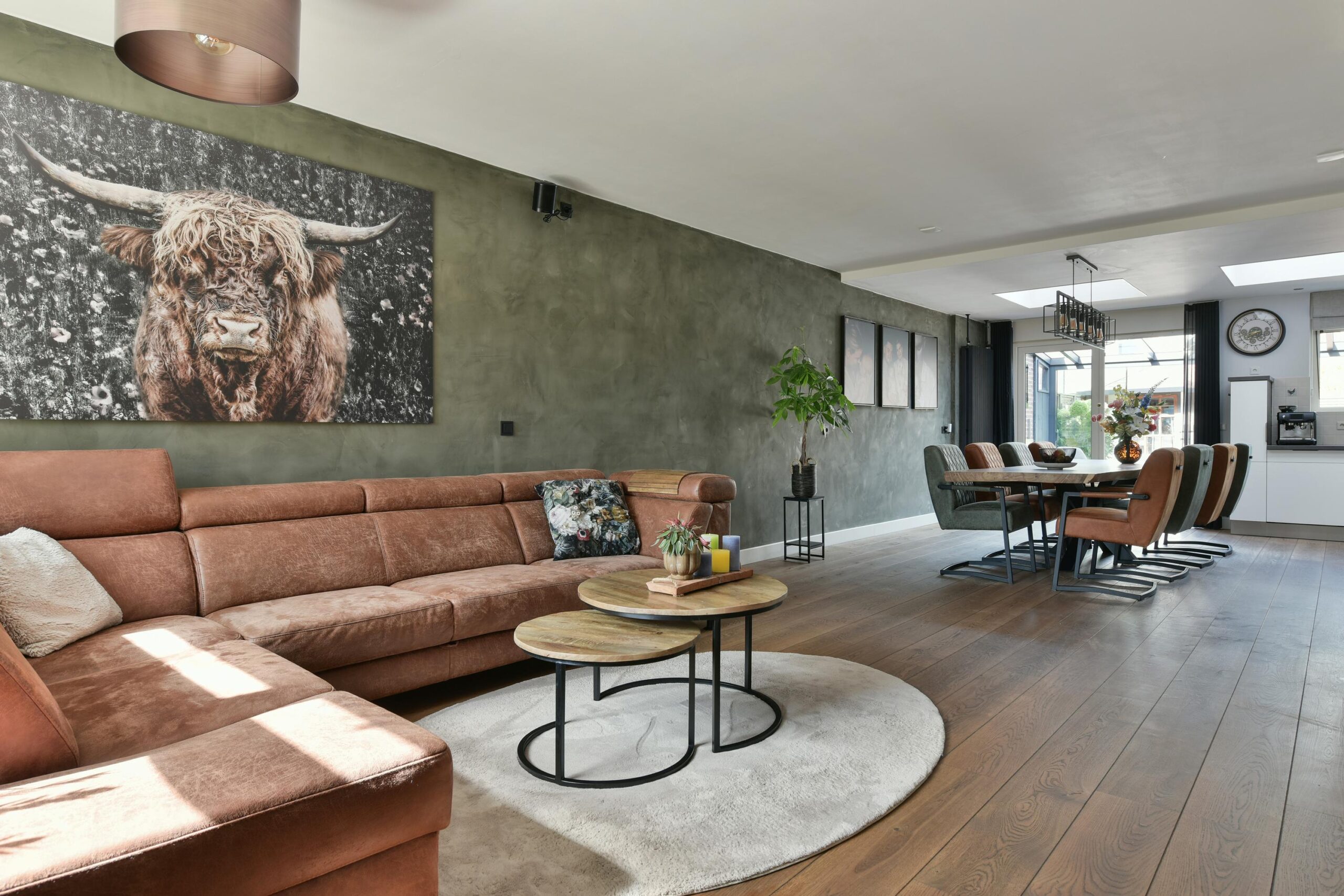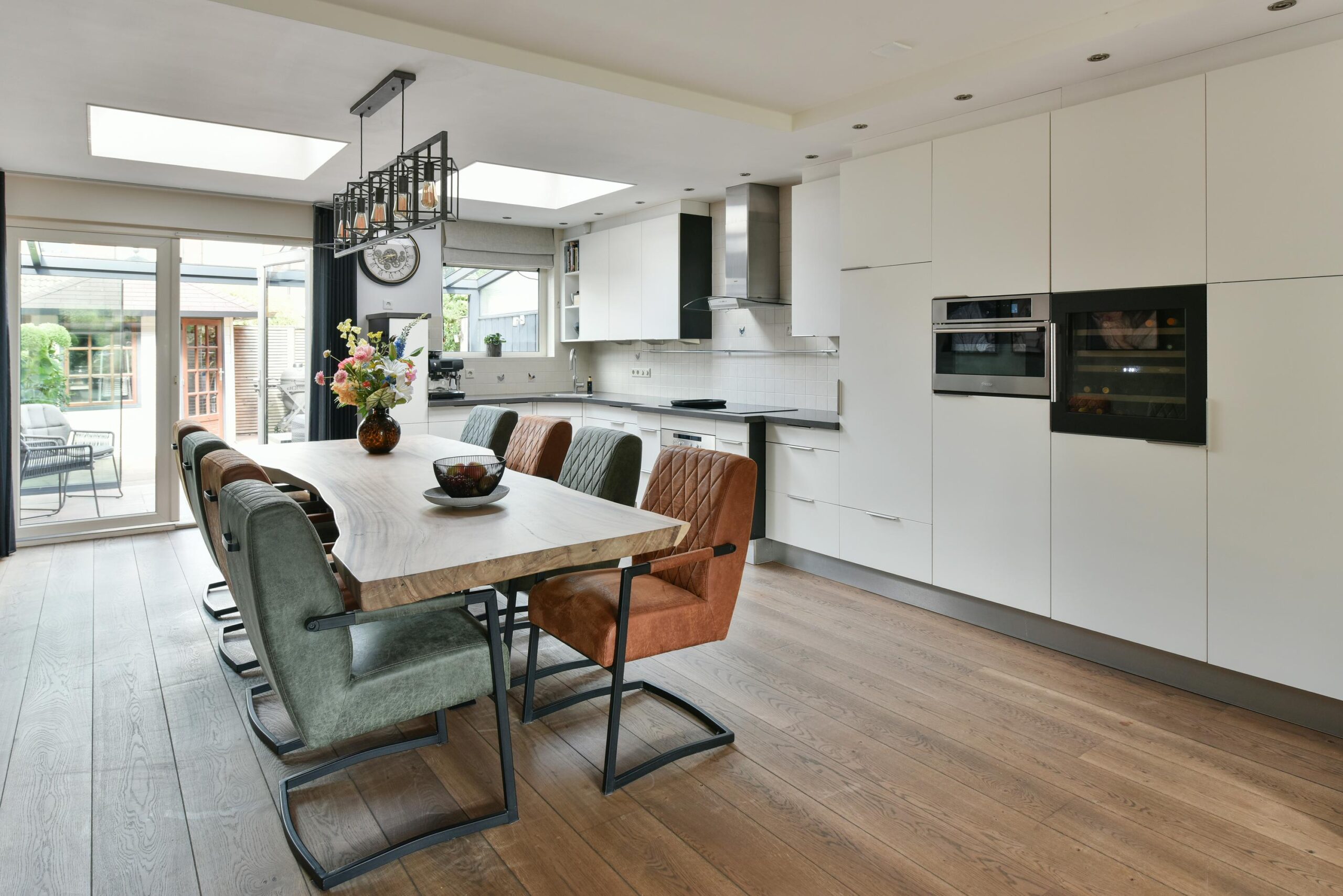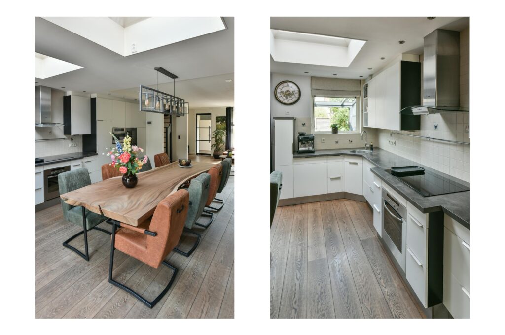 De sfeervolle en over de volle breedte uitgebouwde woonkamer met fraaie houten Eiken vloerdelen is ingedeeld met een ruime zithoek aan de voorzijde en een grote woonkeuken aan de tuinzijde. De dakkoepels in de uitbouw zorgen voor extra lichtinval aan de achterzijde van de woonkamer. In de woonkeuken is plaats voor een grote eettafel.