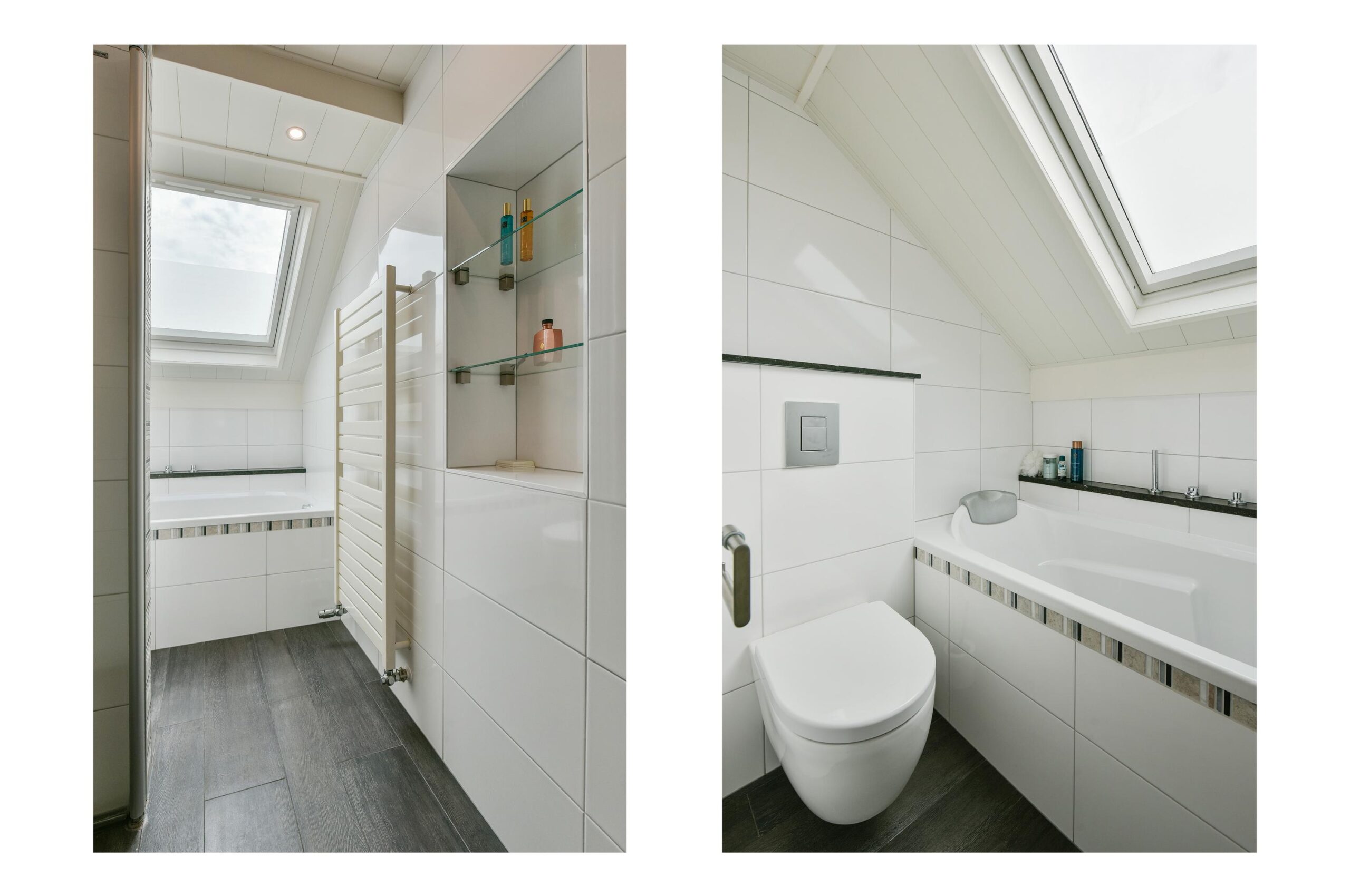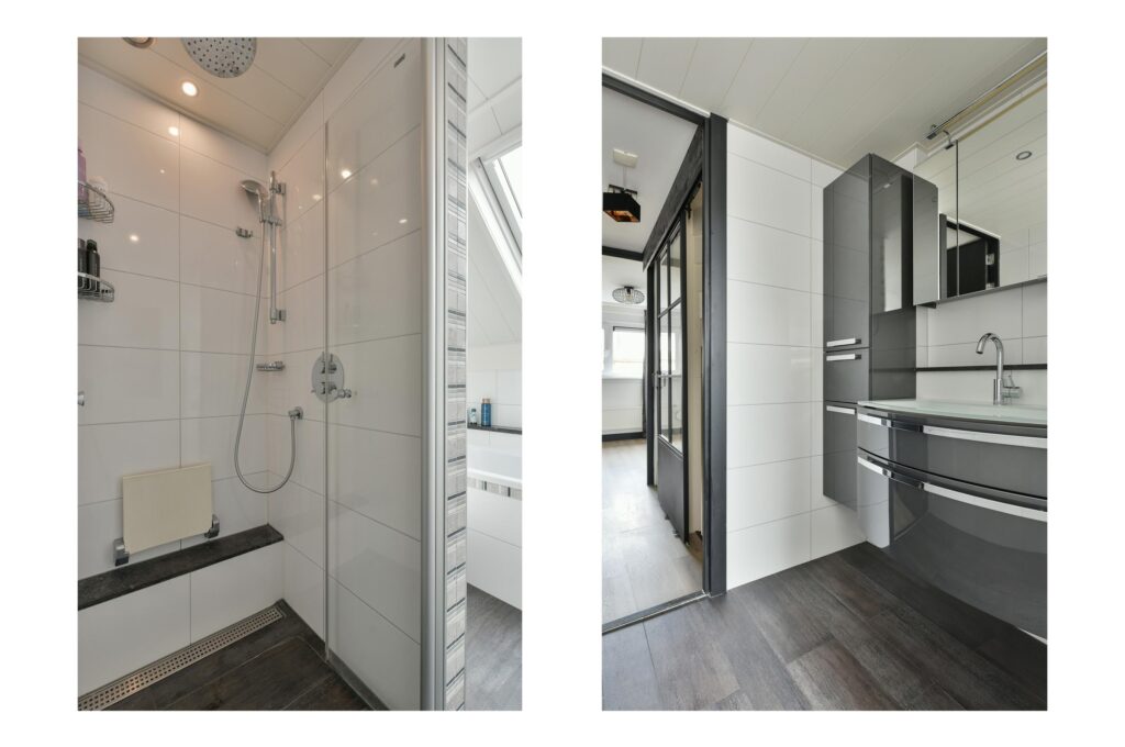 De betegelde badkamer heeft zowel een heerlijk ligbad, als een ruime inloopdouche. Tevens is er een breed wastafelmeubel en een apart toilet. De betegelde vloer heeft elektrische vloerverwarming. Een heerlijke wellness ruimte!