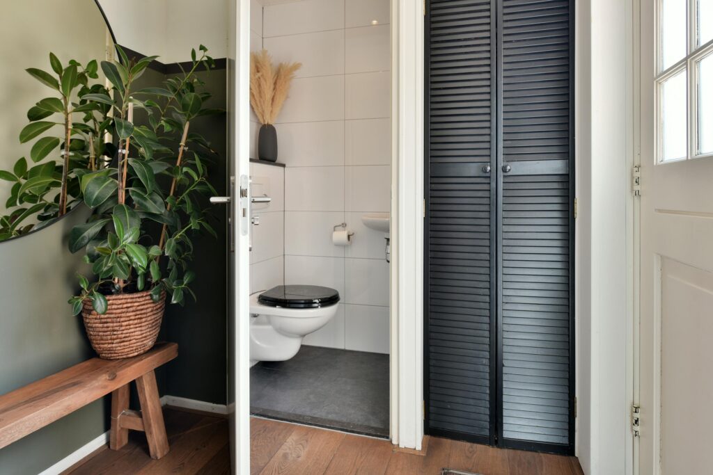 De toiletruimte is modern, er is een vrij hangend closet en de wanden zijn betegeld.