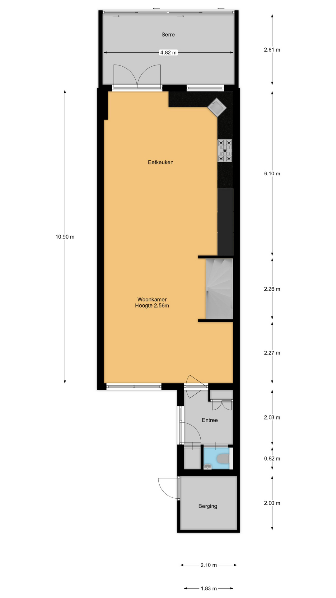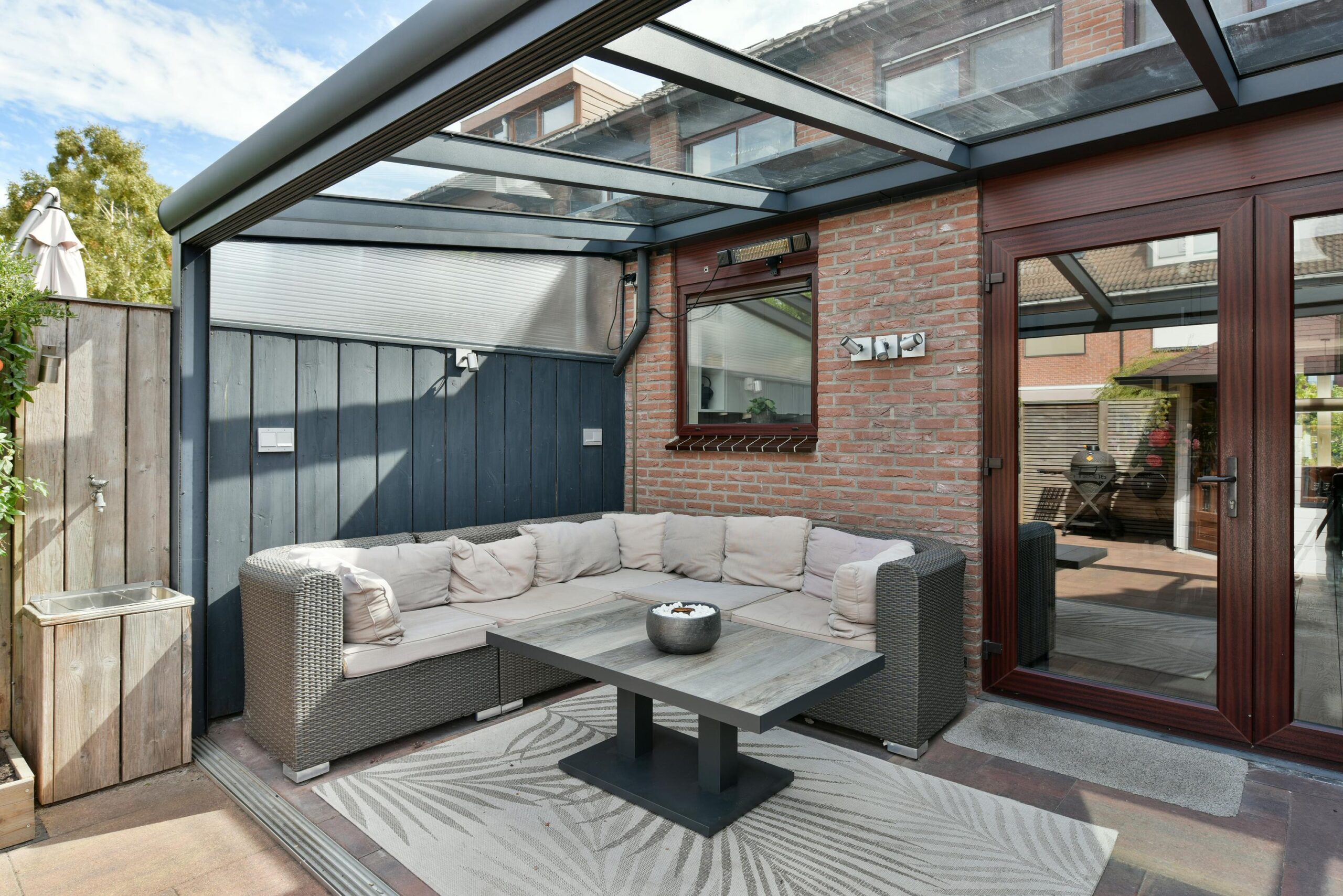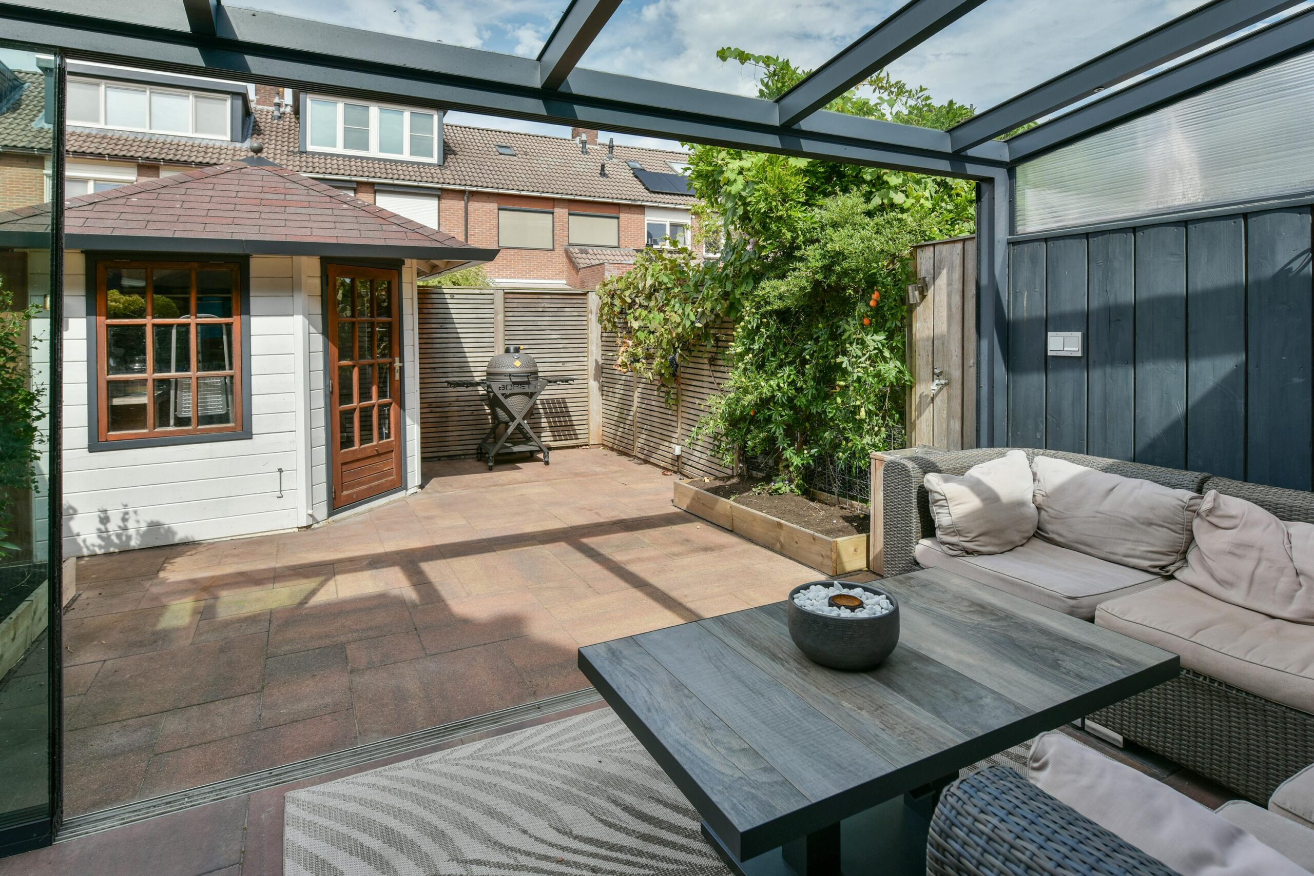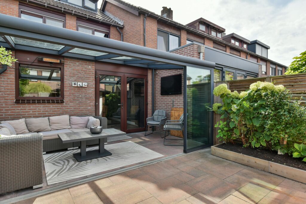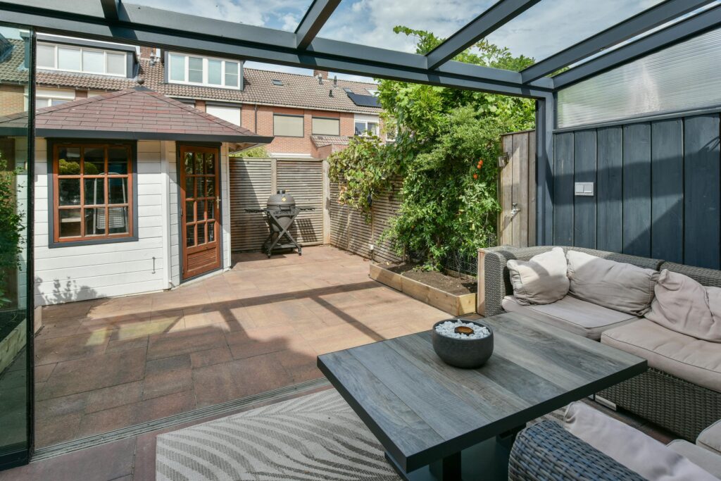 De aangebouwde serre met glazen schuifdeuren – bereikbaar via openslaande deuren- zorgt voor nog meer comfortabele leefruimte, inclusief de aangrenzende geheel betegelde achtertuin met achterom en houten berging.