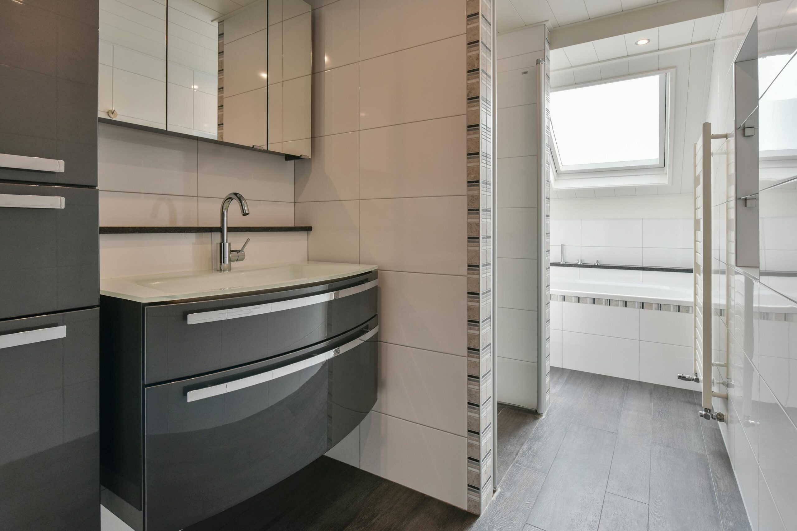 De moderne badkamer heeft een groot kunststof dakraam waardoor er volop lichtinval en extra ventilatie is.