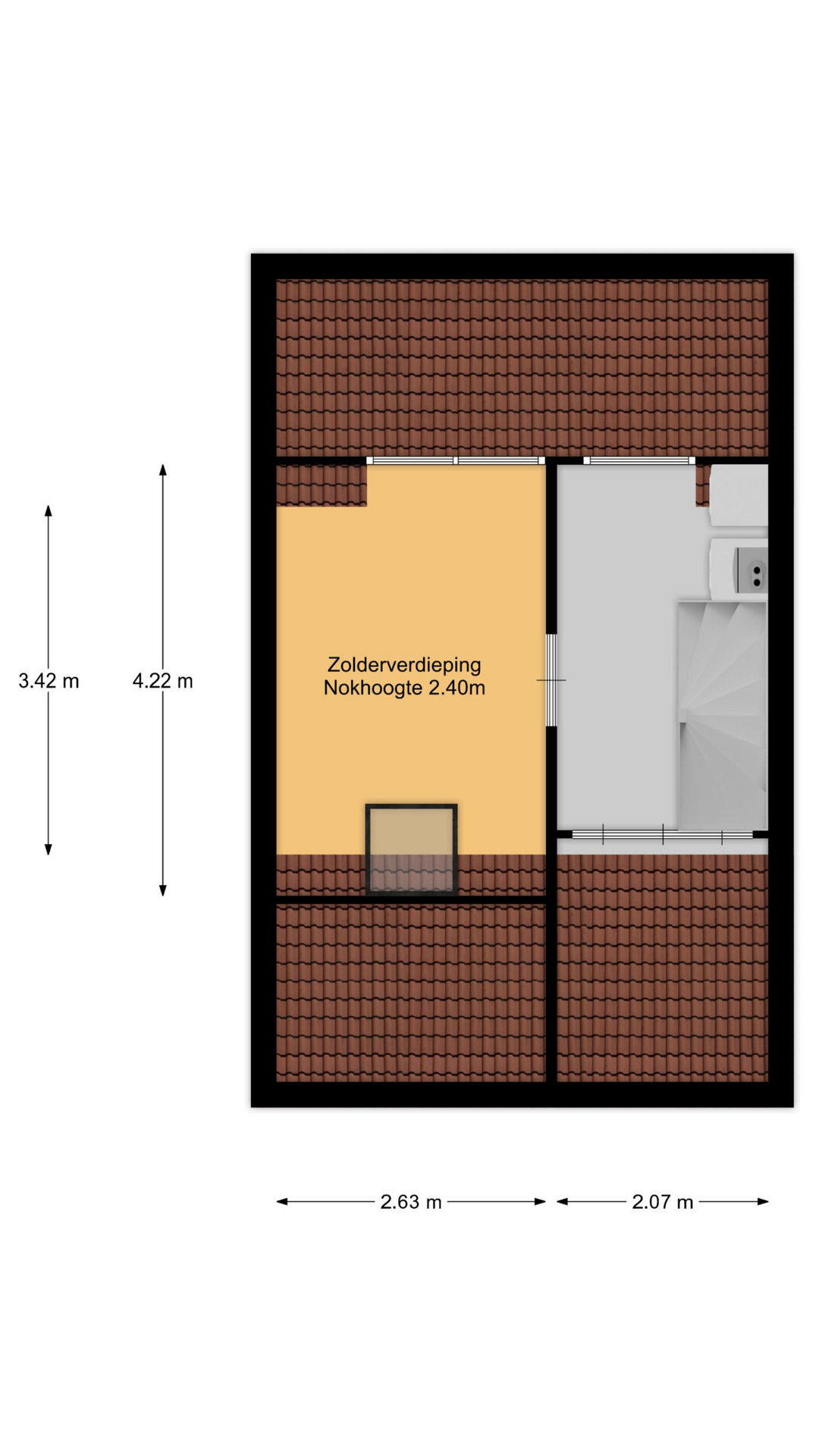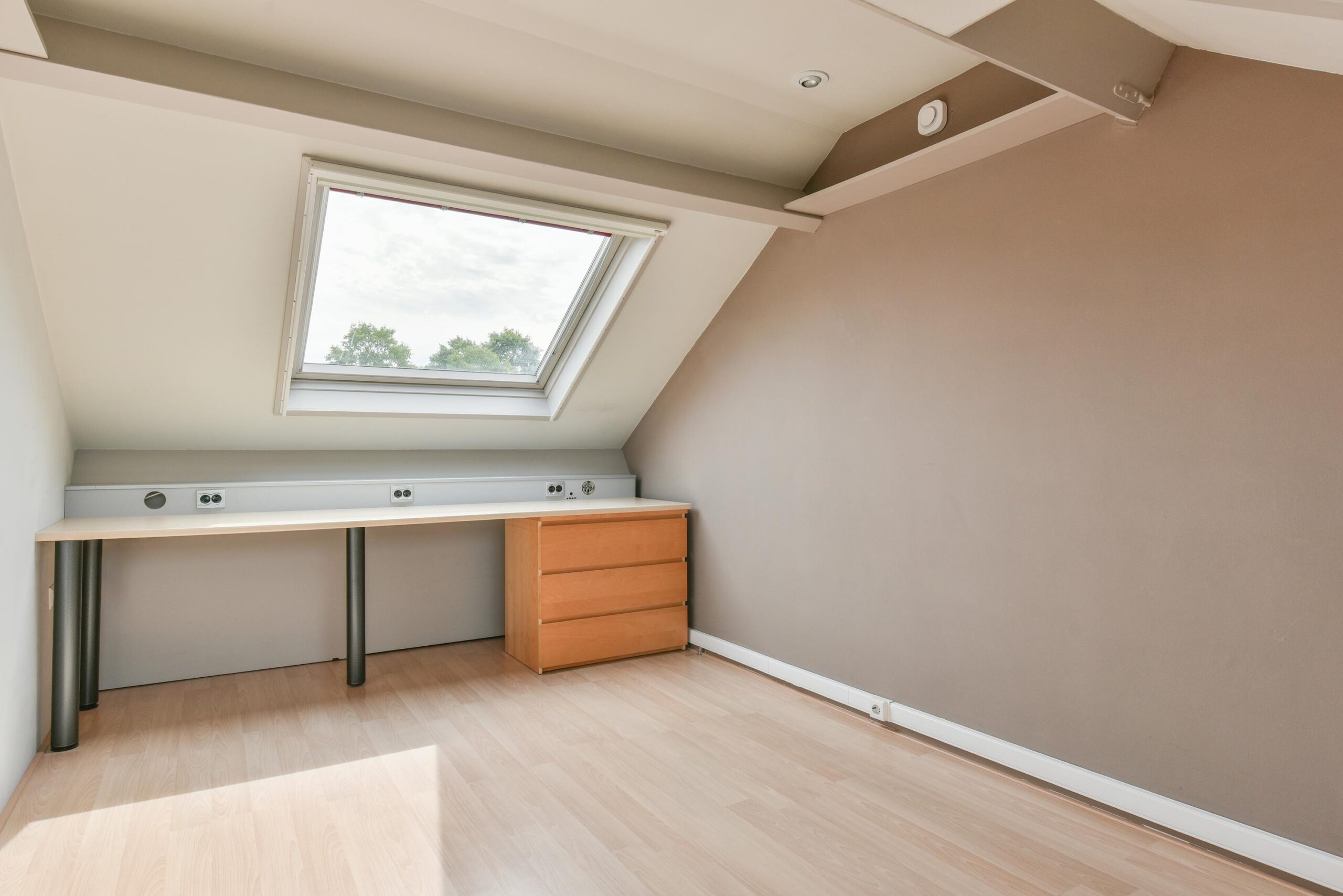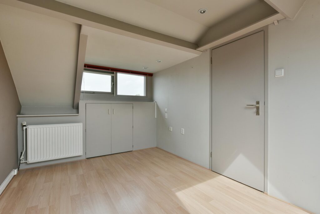 De ruime zolderkamer heeft een dakraam aan de voorzijde en een dakkapel aan de achterzijde met daaronder extra bergruimte.