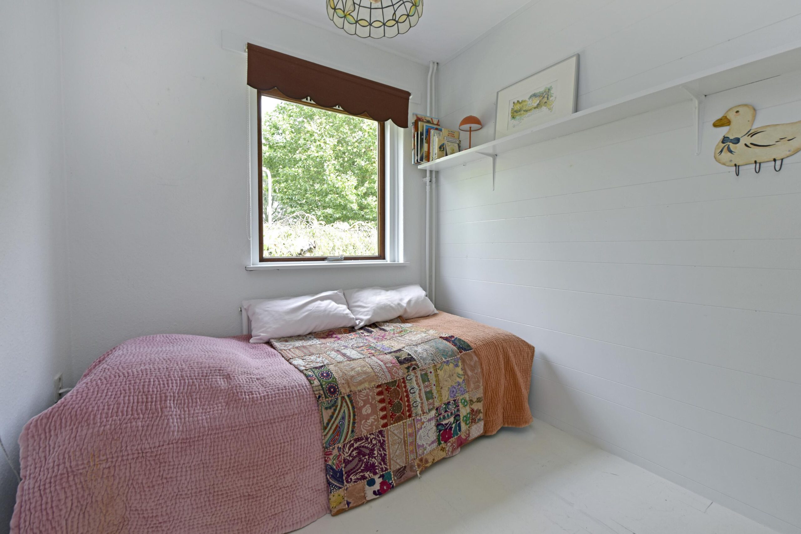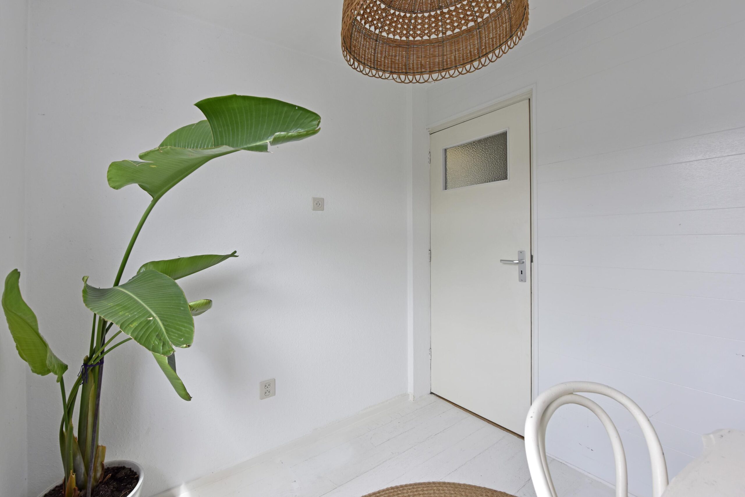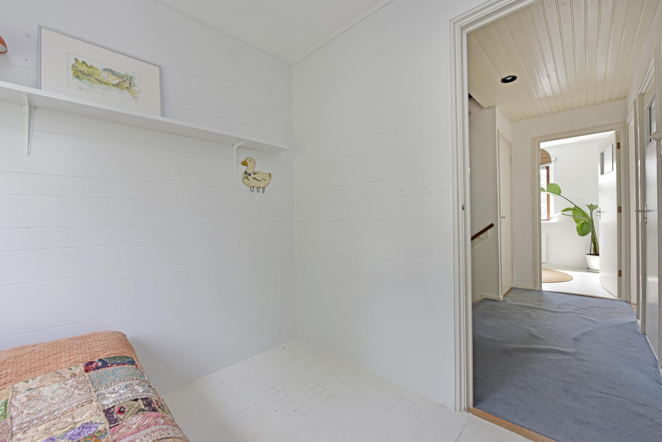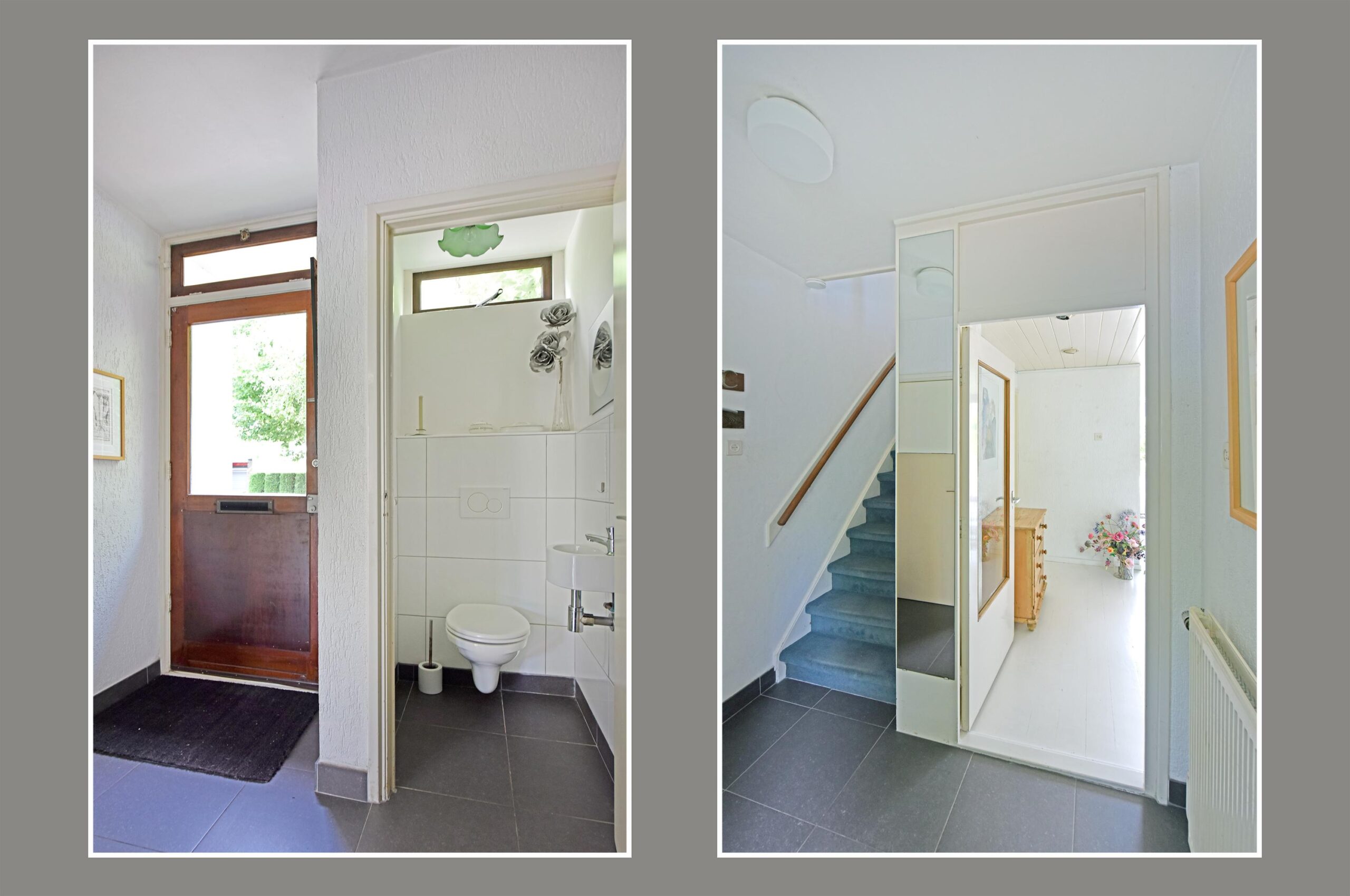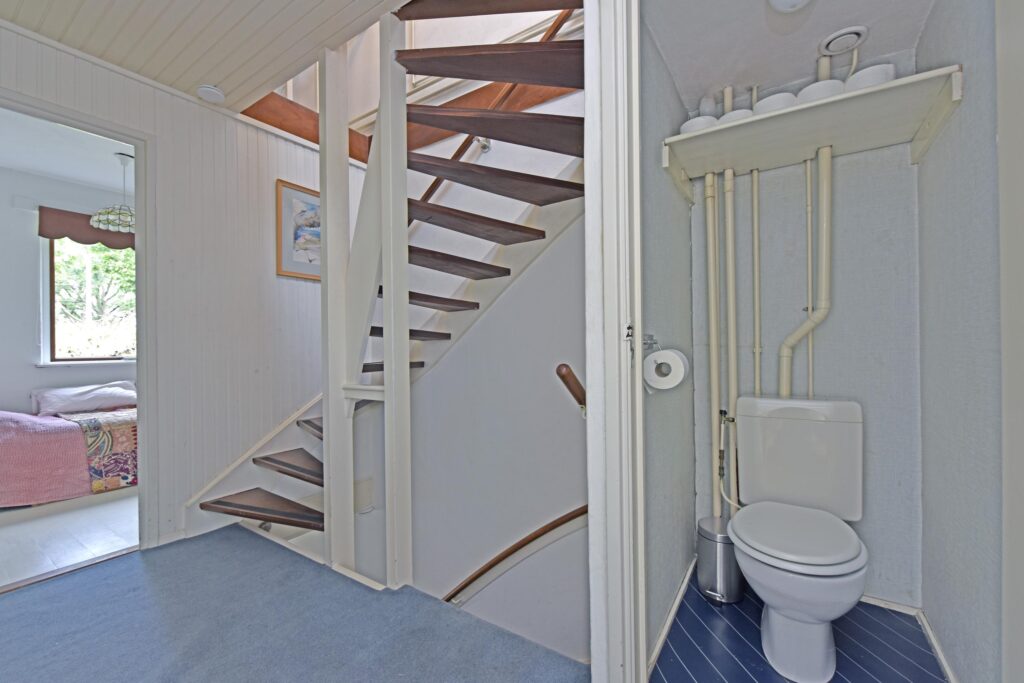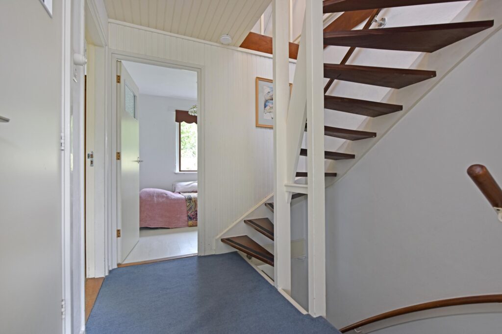 At the front of the house, you’ll find a lovely green garden. The entrance leads into the hallway with the staircase to the upper floor. A toilet is also located in the hall.
