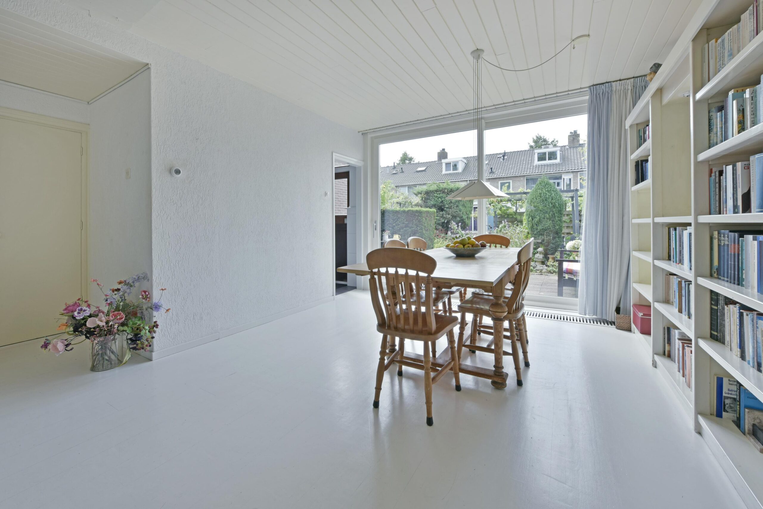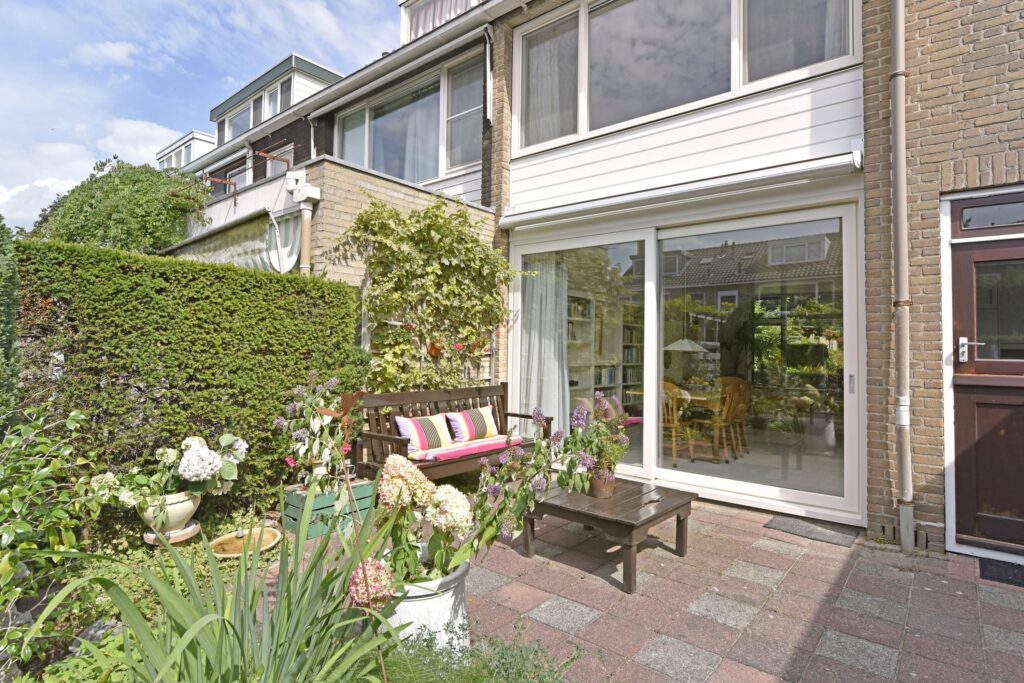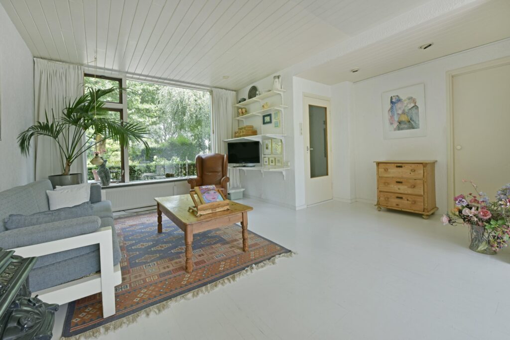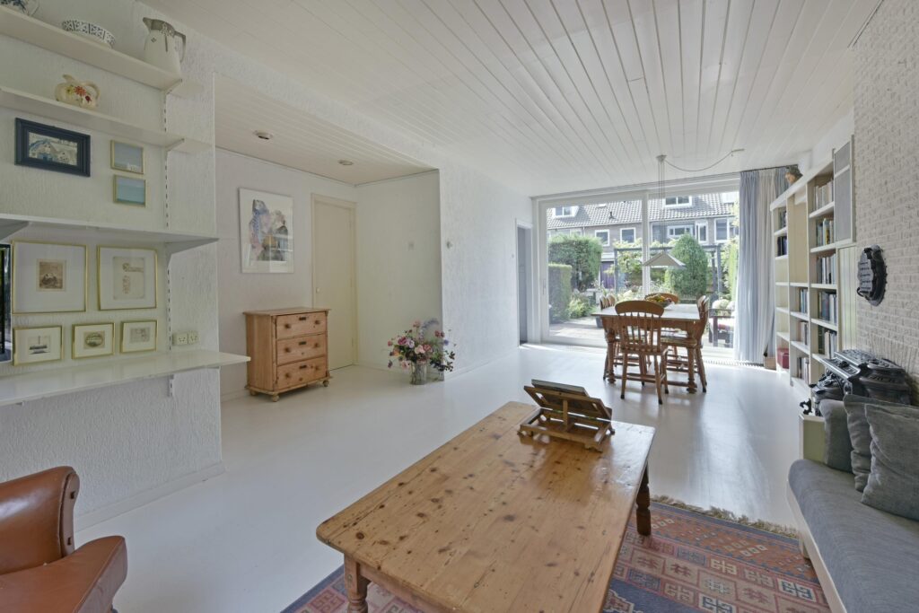 De woonkamer is royaal en heeft een speelse indeling. De zithoek is nu aan de voorkant en aan de achterzijde is de eettafel geplaatst. Via de aanwezige schuifpui (kunststof tevens convectorput aanwezig) bereik je de heerlijke achtertuin met zowel diverse zitjes als mooie borders met beplanting.