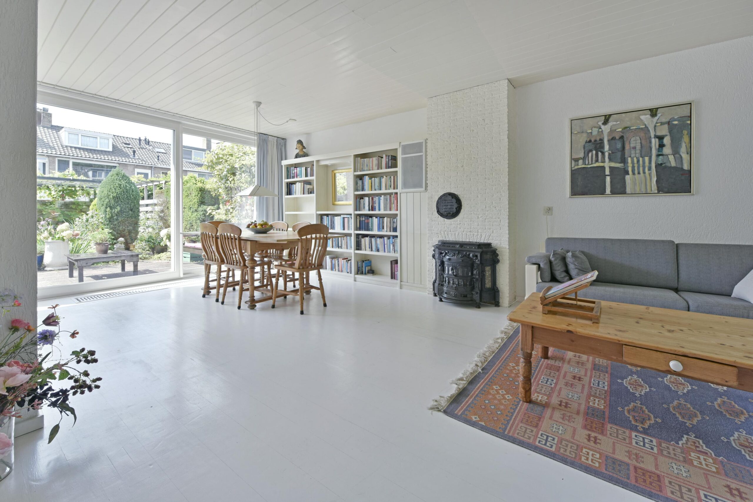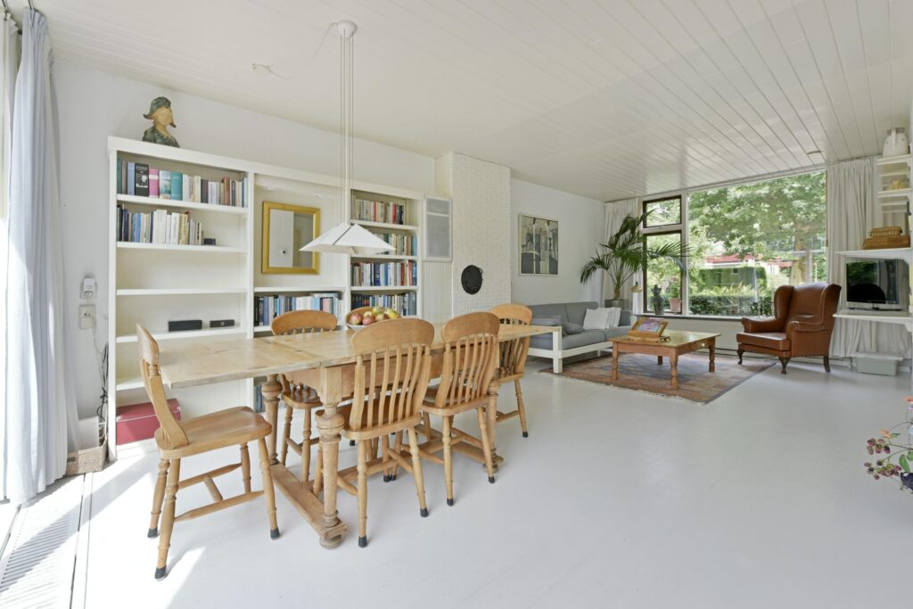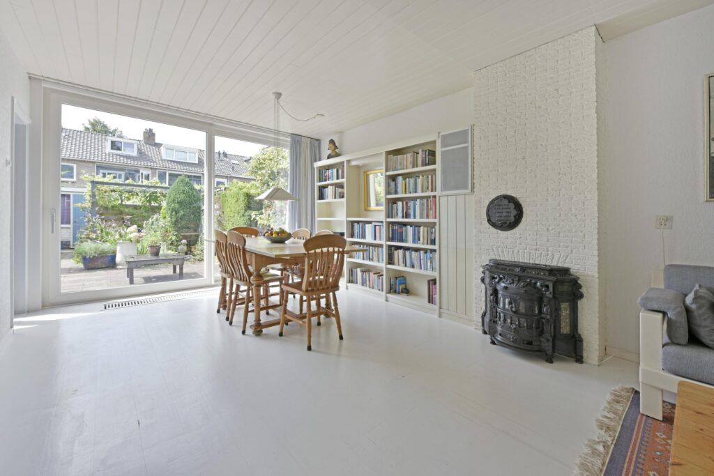 The living room is spacious with a playful layout. Currently, the sitting area is at the front, and the dining area is positioned at the rear. Through the sliding doors (PVC with a convector trench heater), you can access the sunny backyard, which features multiple seating areas and attractive planted borders.