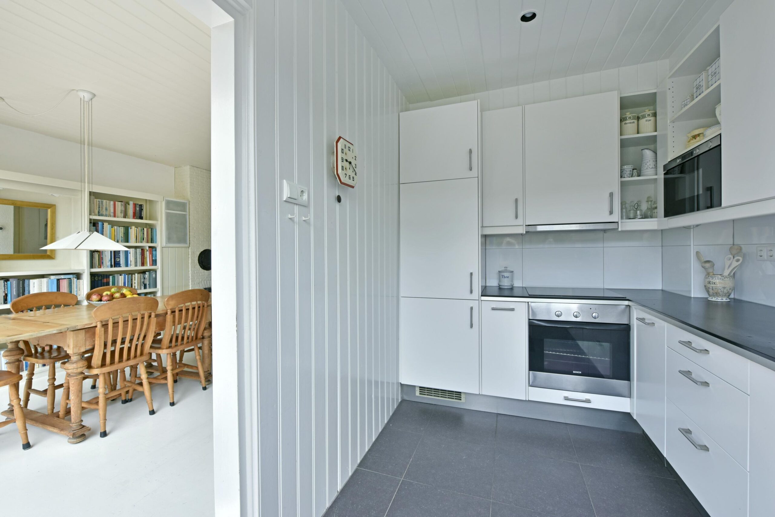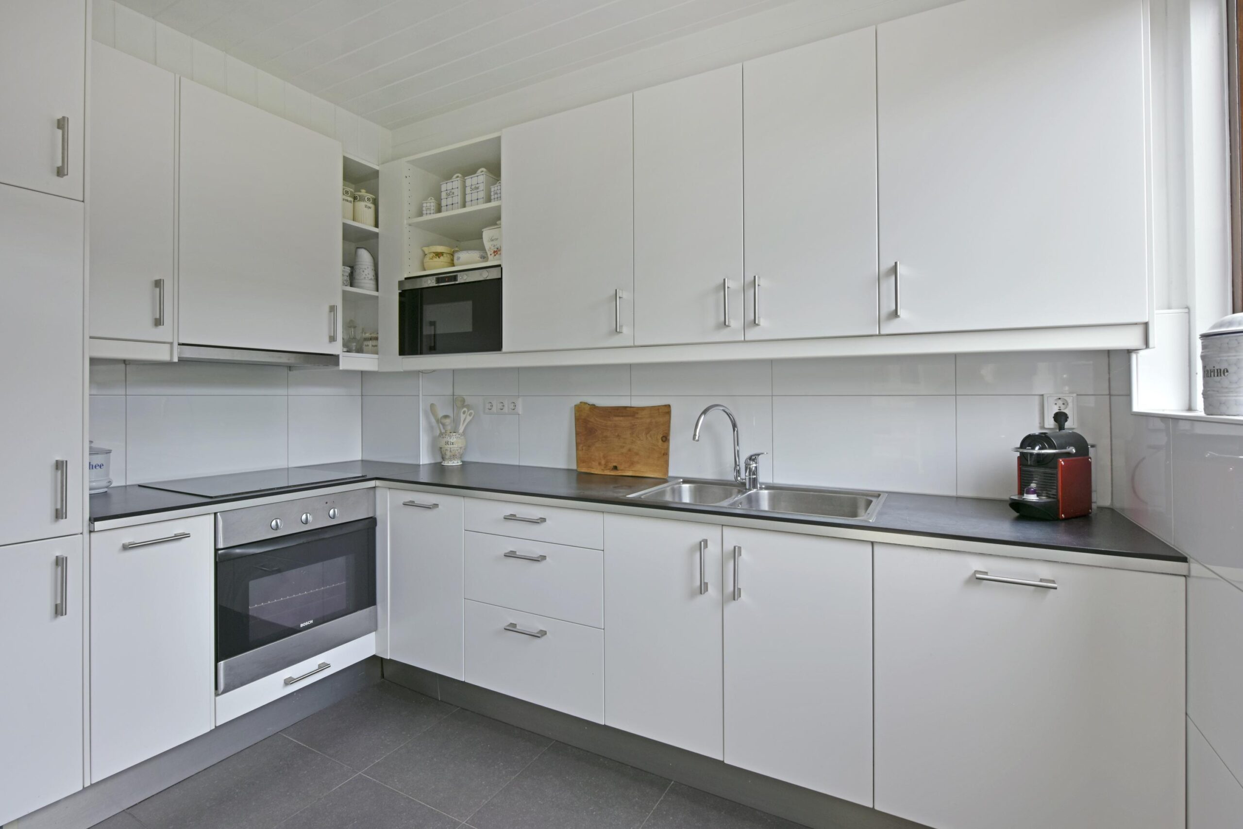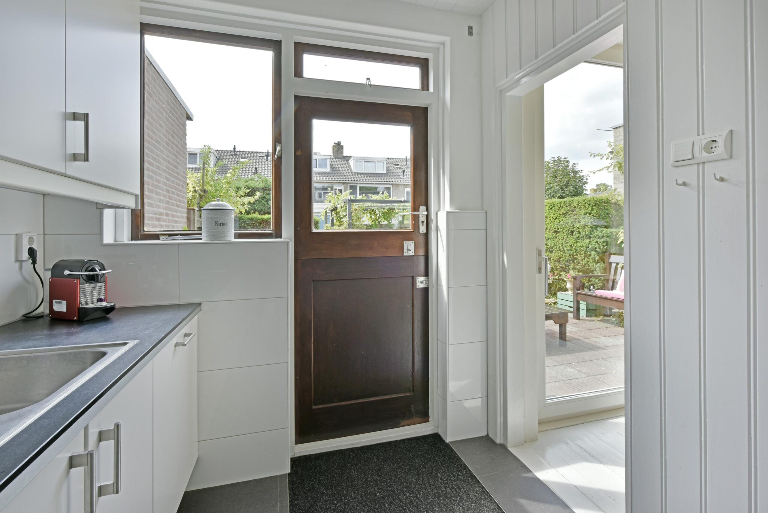 De gesloten keuken heeft een eigen deur naar de achtertuin. De moderne keuken (2015) is geplaatst in een hoekopstelling en heeft diverse apparatuur.
