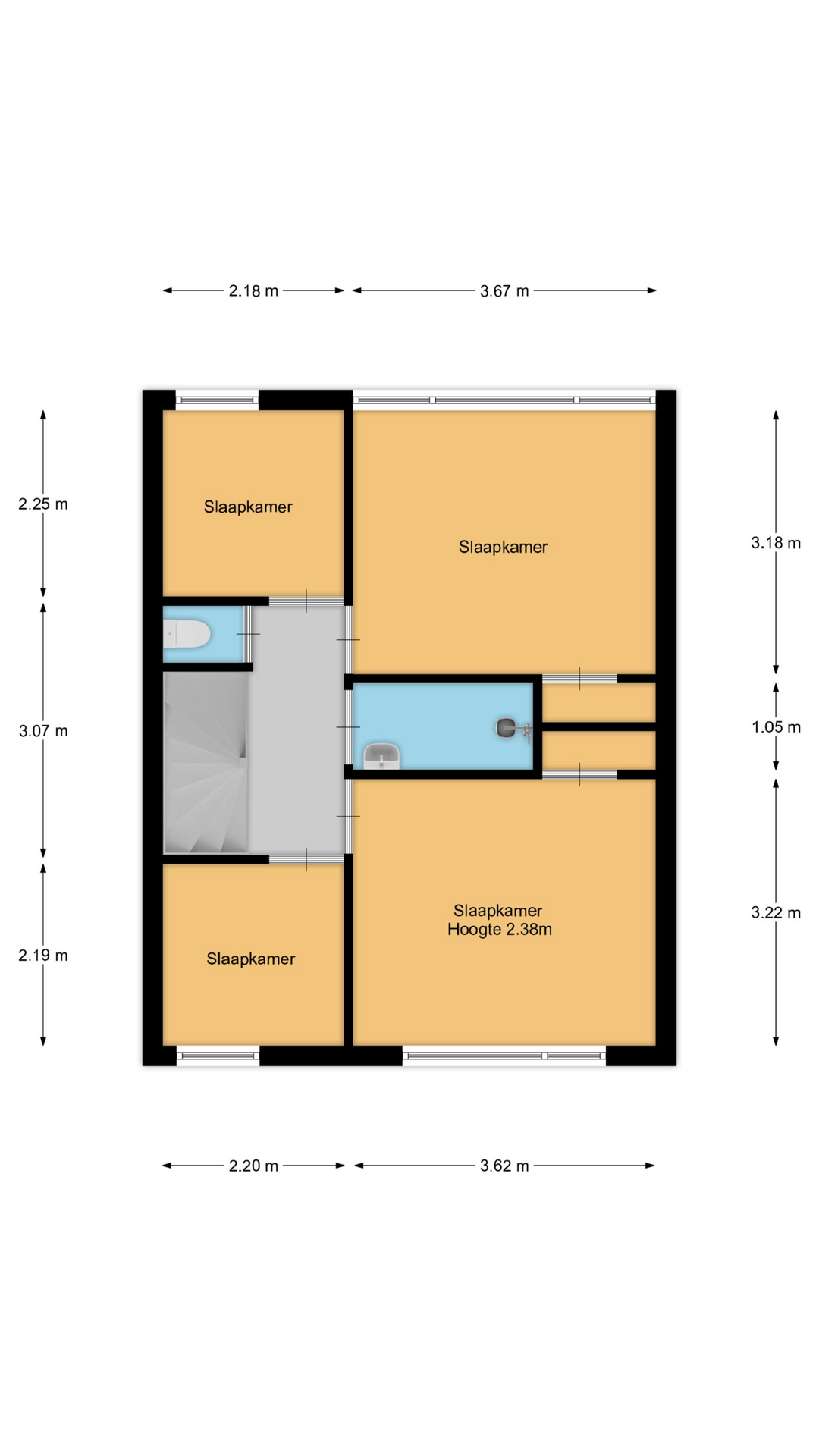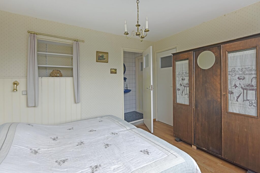 De verdieping heeft 4 slaapkamers. 2 daarvan hebben praktische inbouwkasten. De badkamer/badcel heeft een inloopdouche en een vaste wastafel.