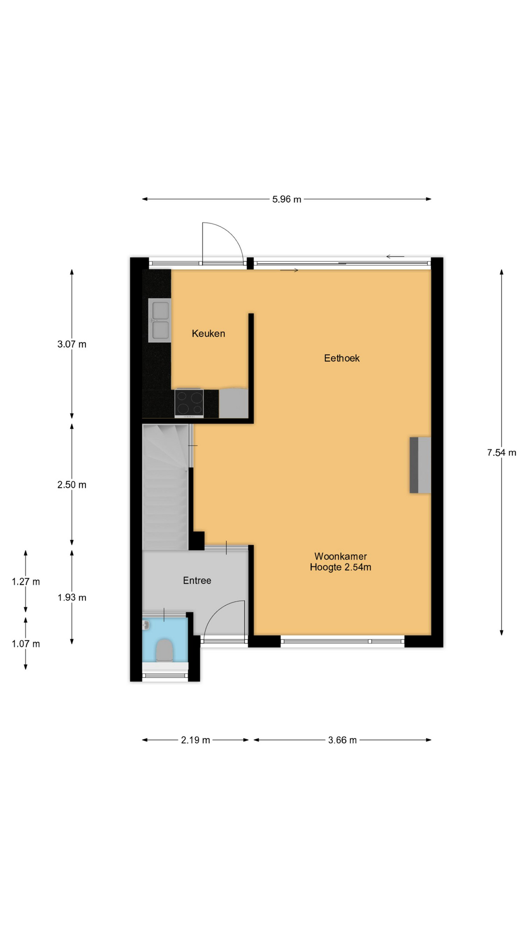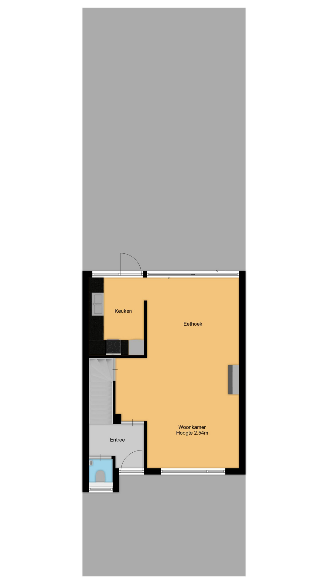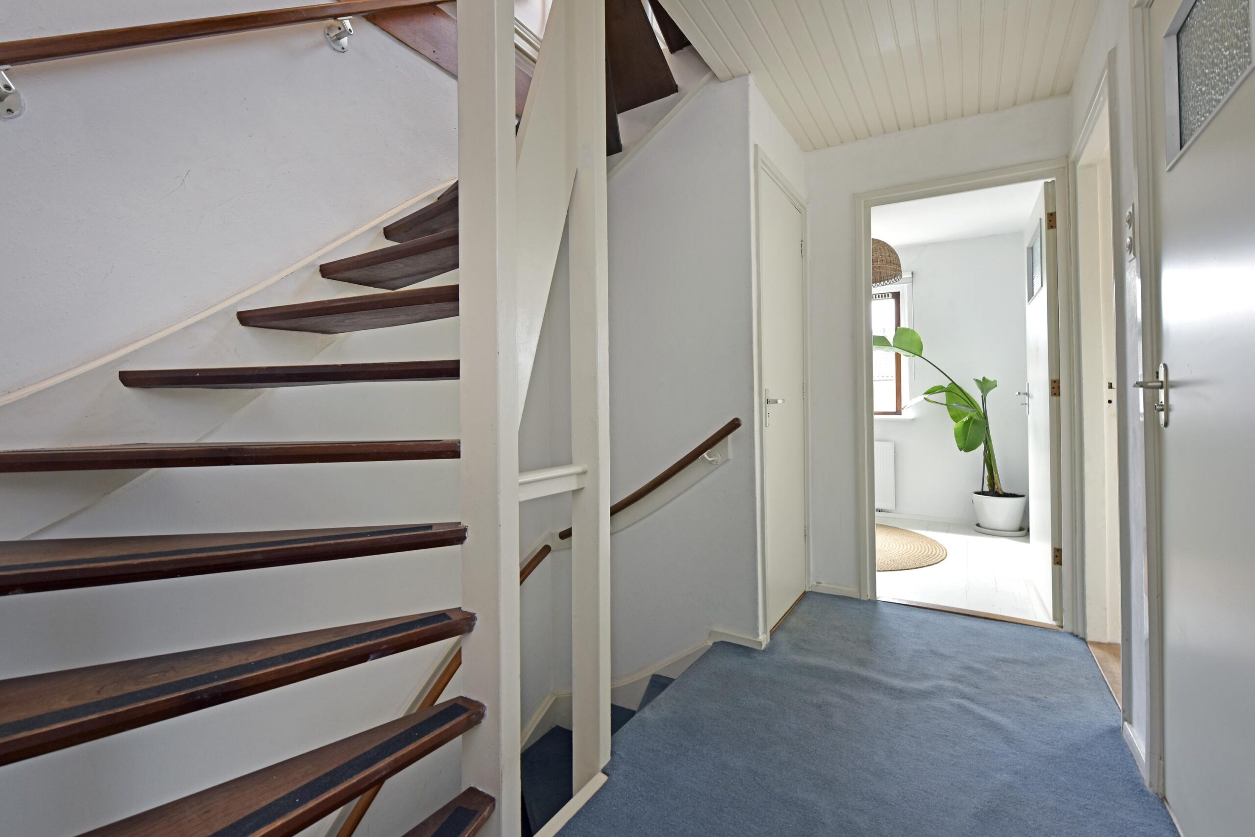 Aan de voorzijde van de woning is een mooie groene tuin. De entree geeft toegang tot de hal met de trapopgang naar de verdieping. In de hal is ook het toilet.