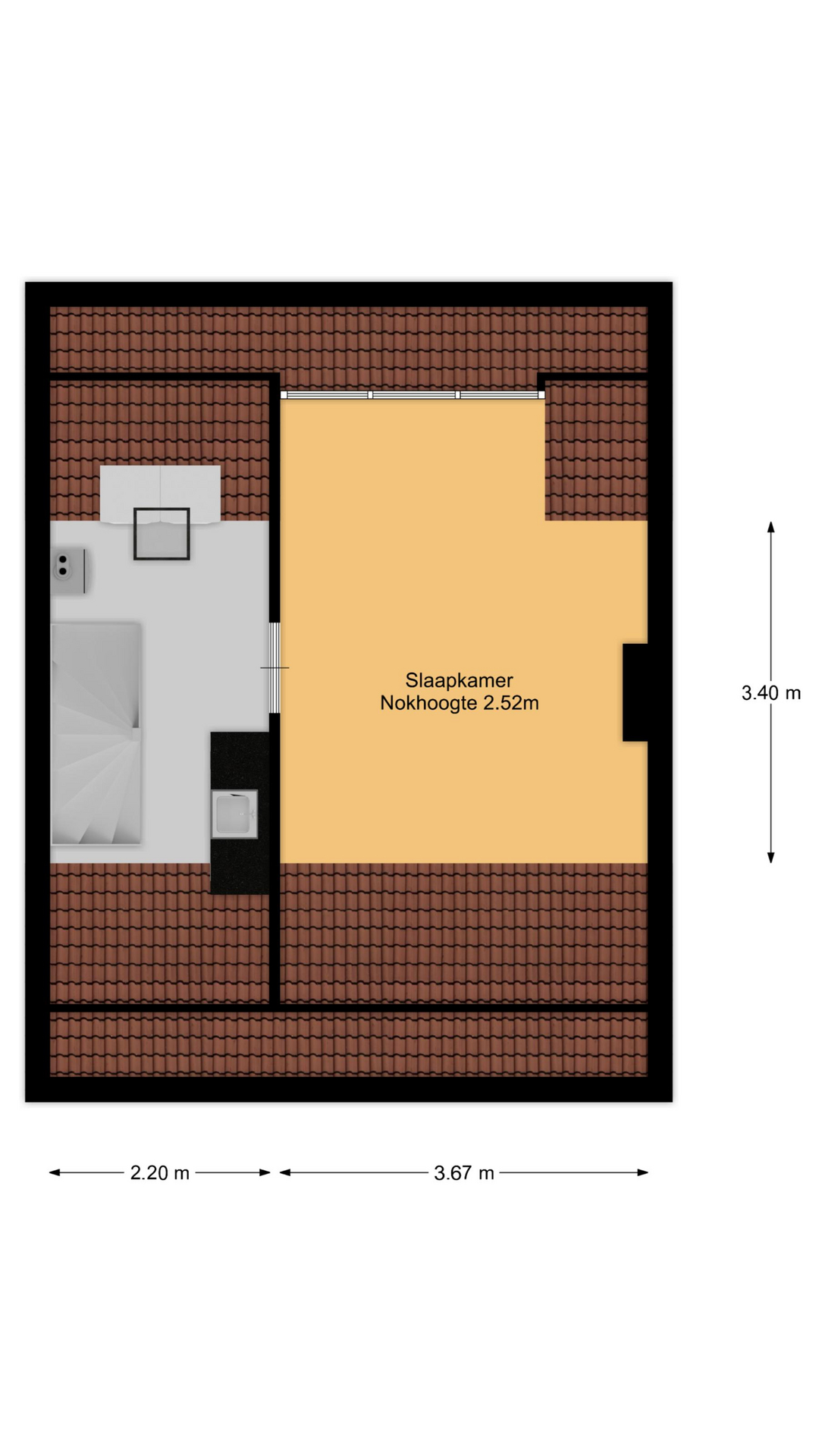 The attic bedroom features a dormer (PVC), which adds extra space and natural light.