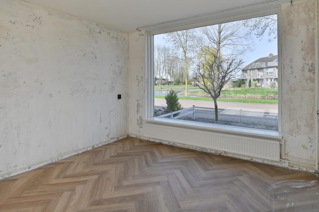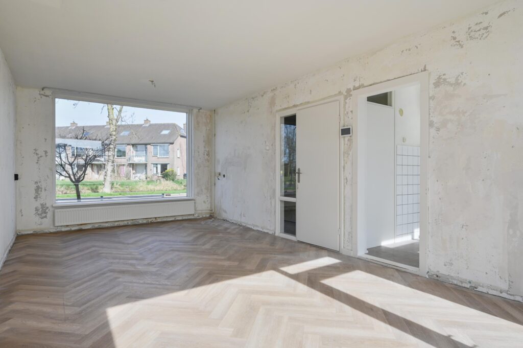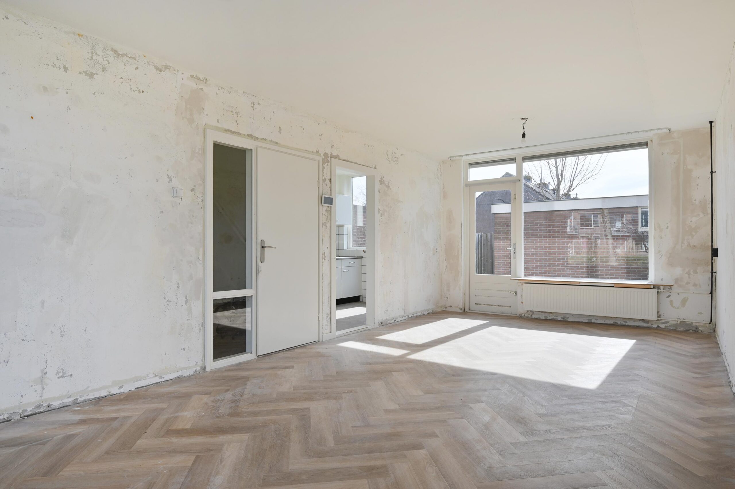 Lichte woonkamer voorzien van fraaie pvc visgraat vloer, semi-open keuken met eenvoudig keukenblok.
