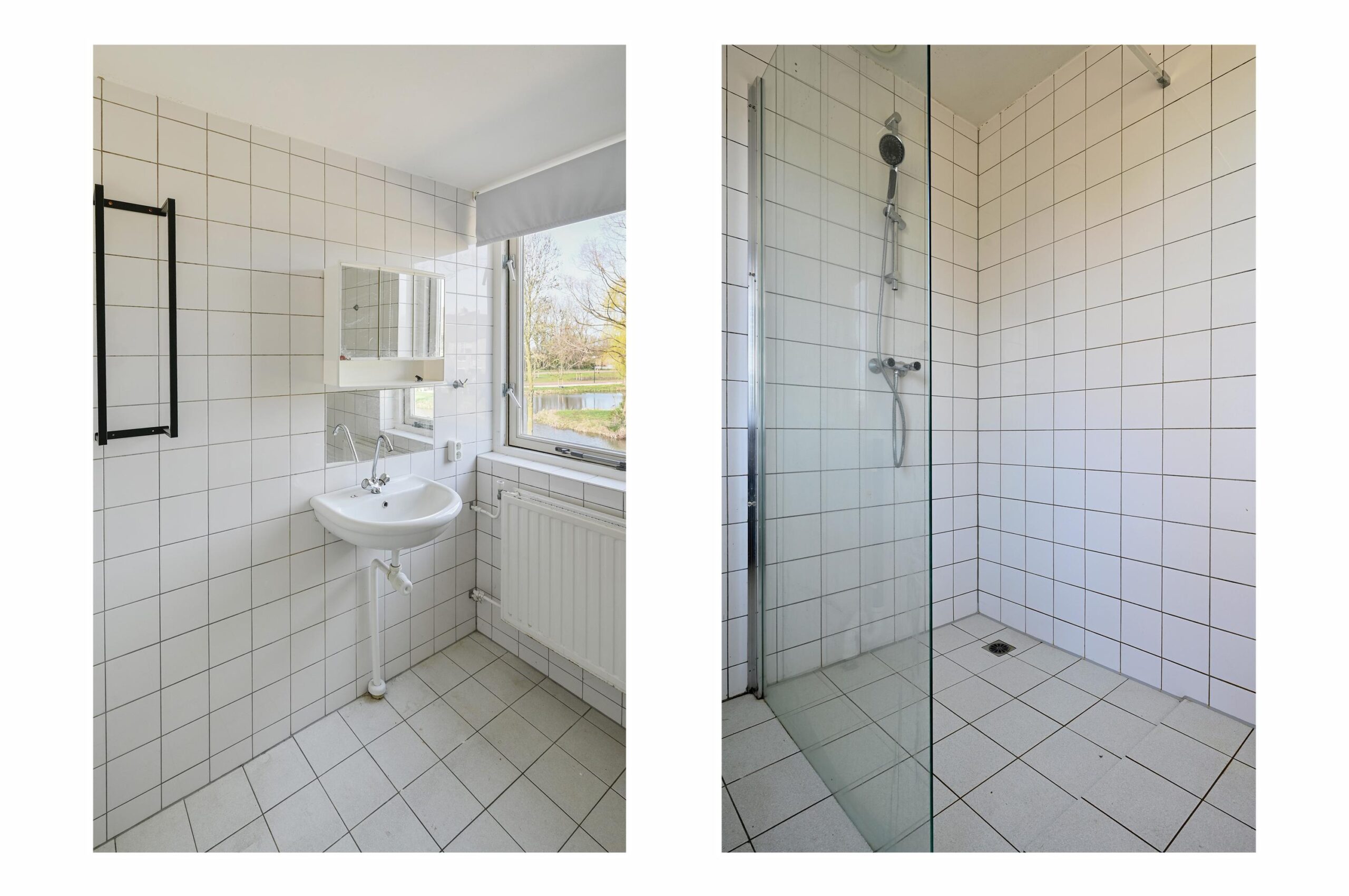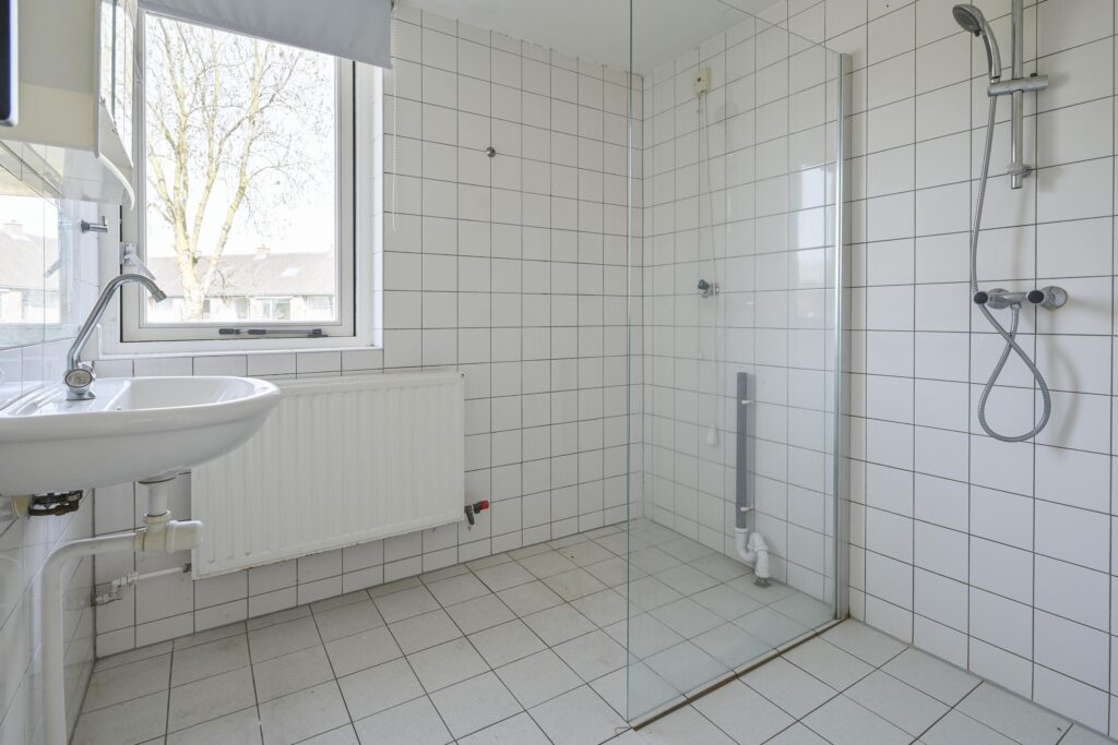 Overloop, badkamer voorzien van douche, wastafel en aansluiting voor de wasmachine.