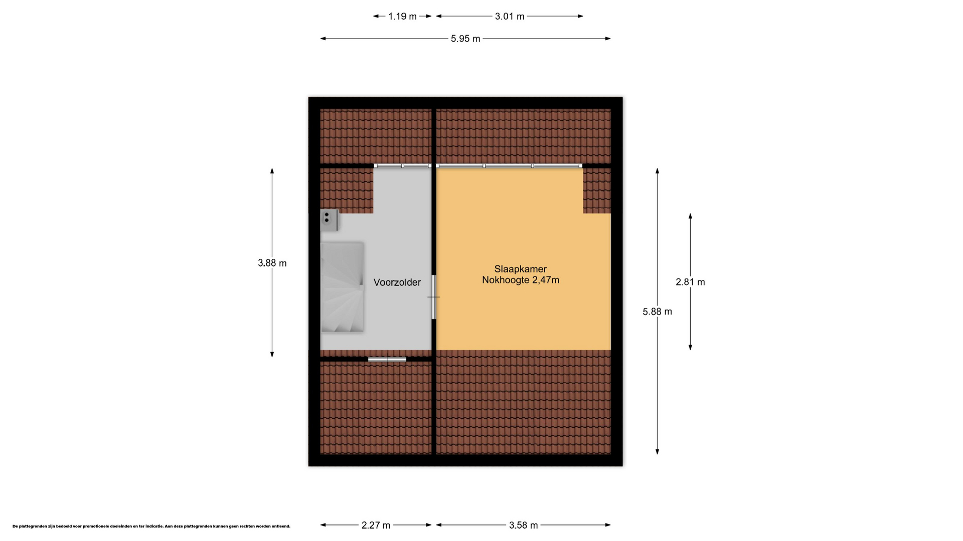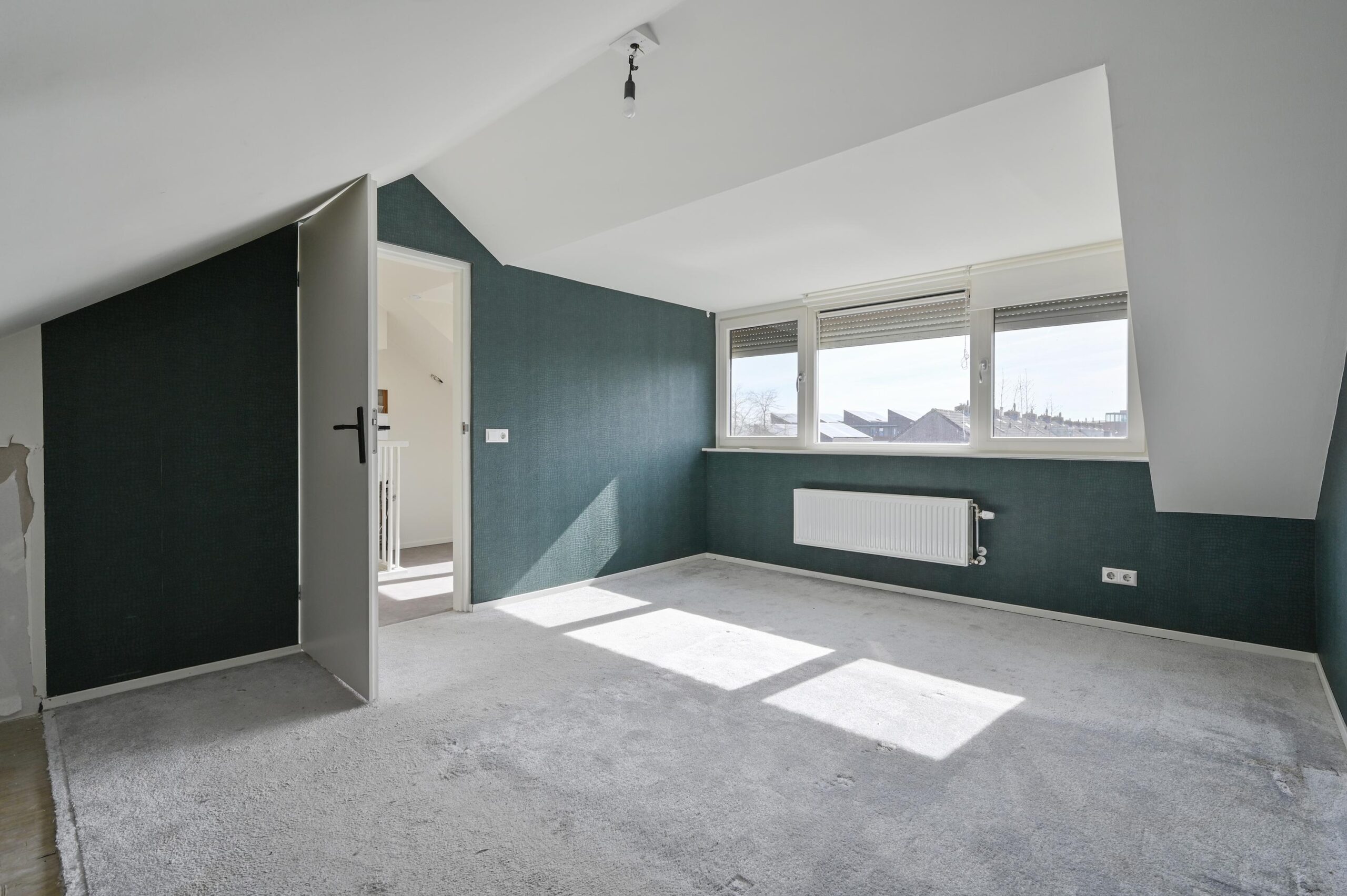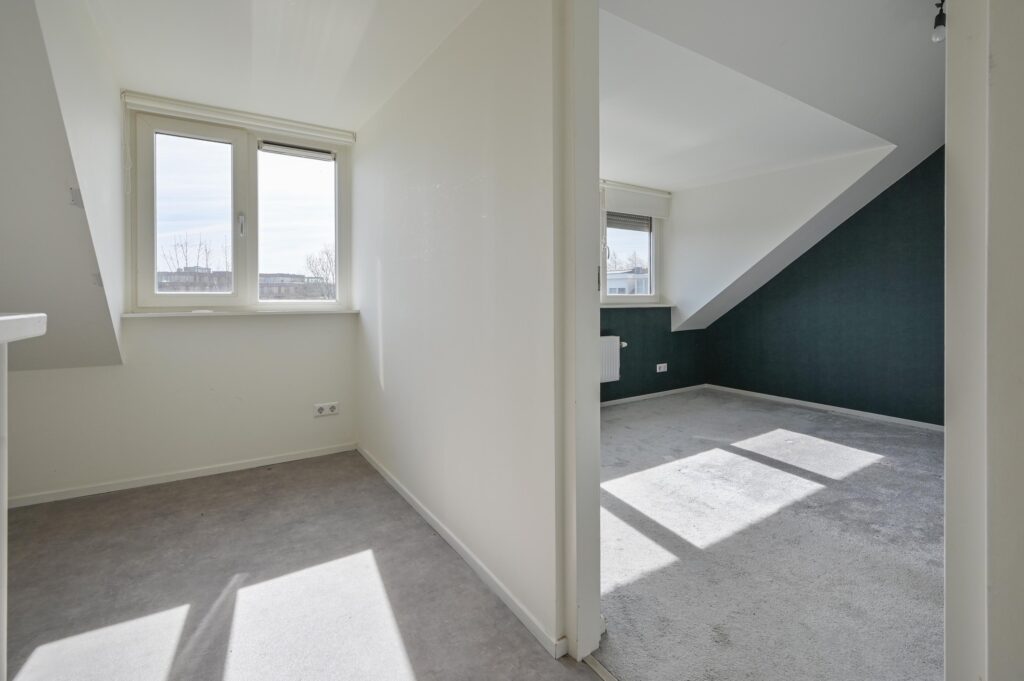 Ruime zolder met cv-opstelling en ruime zolderkamer van ca 8,5 m² met dakkapel voorzien van elektrische rolluiken.