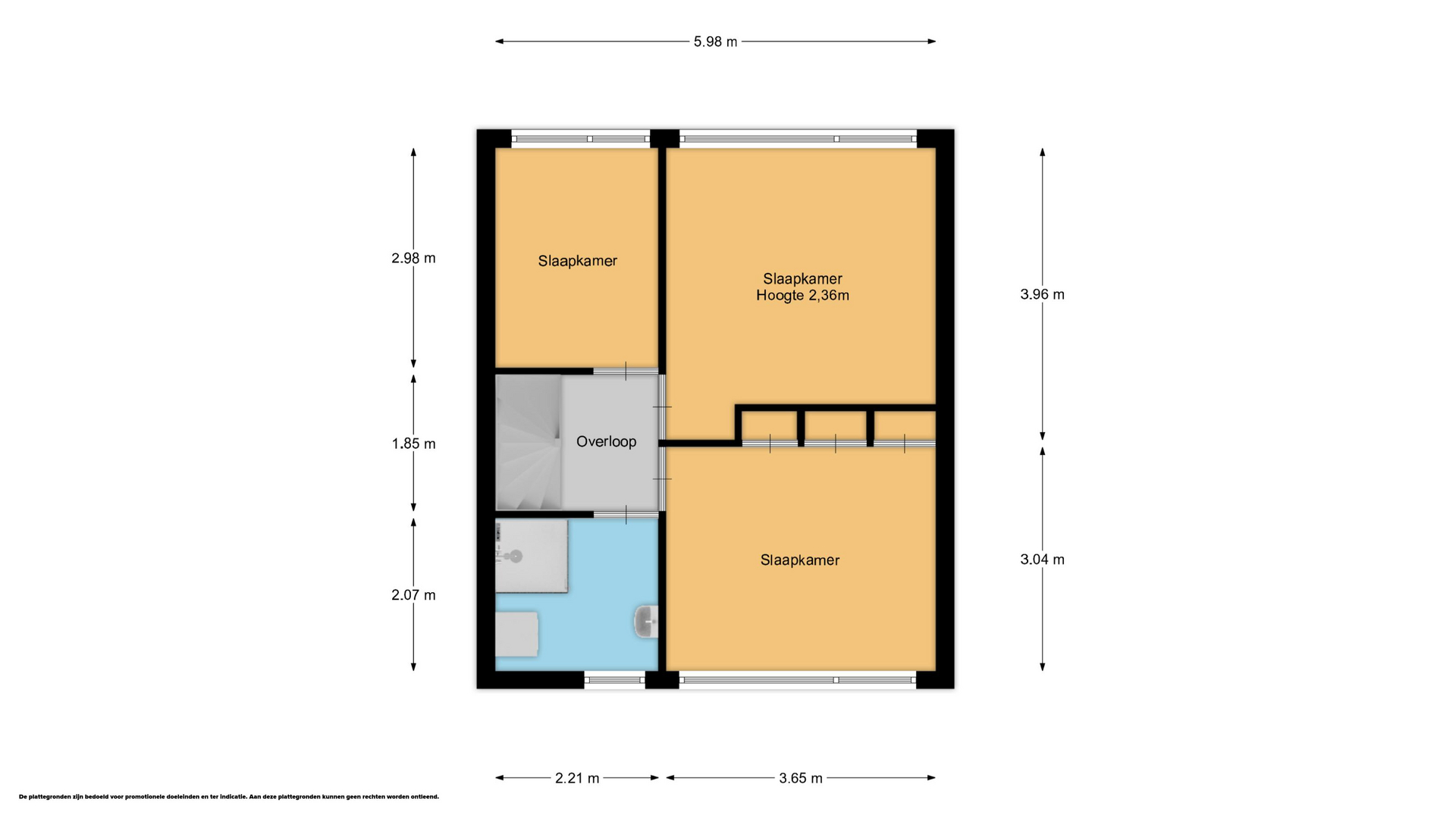 Er zijn drie slaapkamers variërend van circa 14,5 m², 11 m² en 6,6 m². De slaapkamer aan de achterzijde heeft een vaste kastenwand.