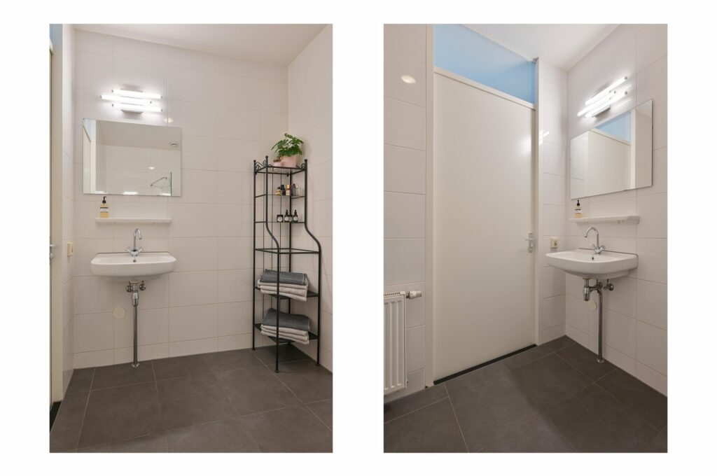 De zeer ruime badkamer is netjes verzorgd en voorzien van een inloopdouche met thermostaatkraan en een wastafel. Dankzij de royale afmetingen is er eventueel ook ruimte voor het plaatsen van een ligbad of extra douche.