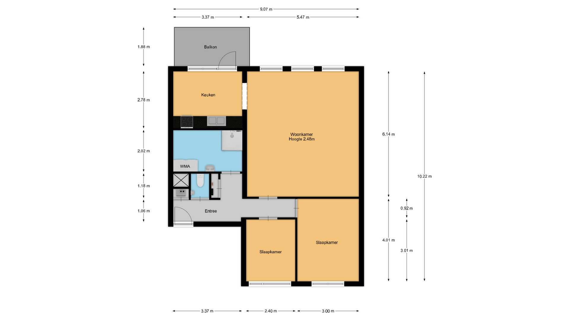 De royale woonkamer met open keuken vormt het hart van de woning en biedt een spectaculair uitzicht over de Amstel. Vanuit de keuken stapt u zo het zonnige balkon op, waar u dankzij de gunstige ligging op het zuiden optimaal kunt genieten van de zon. De twee slaapkamers bevinden zich aan de koele noordzijde, ideaal voor een comfortabele nachtrust.