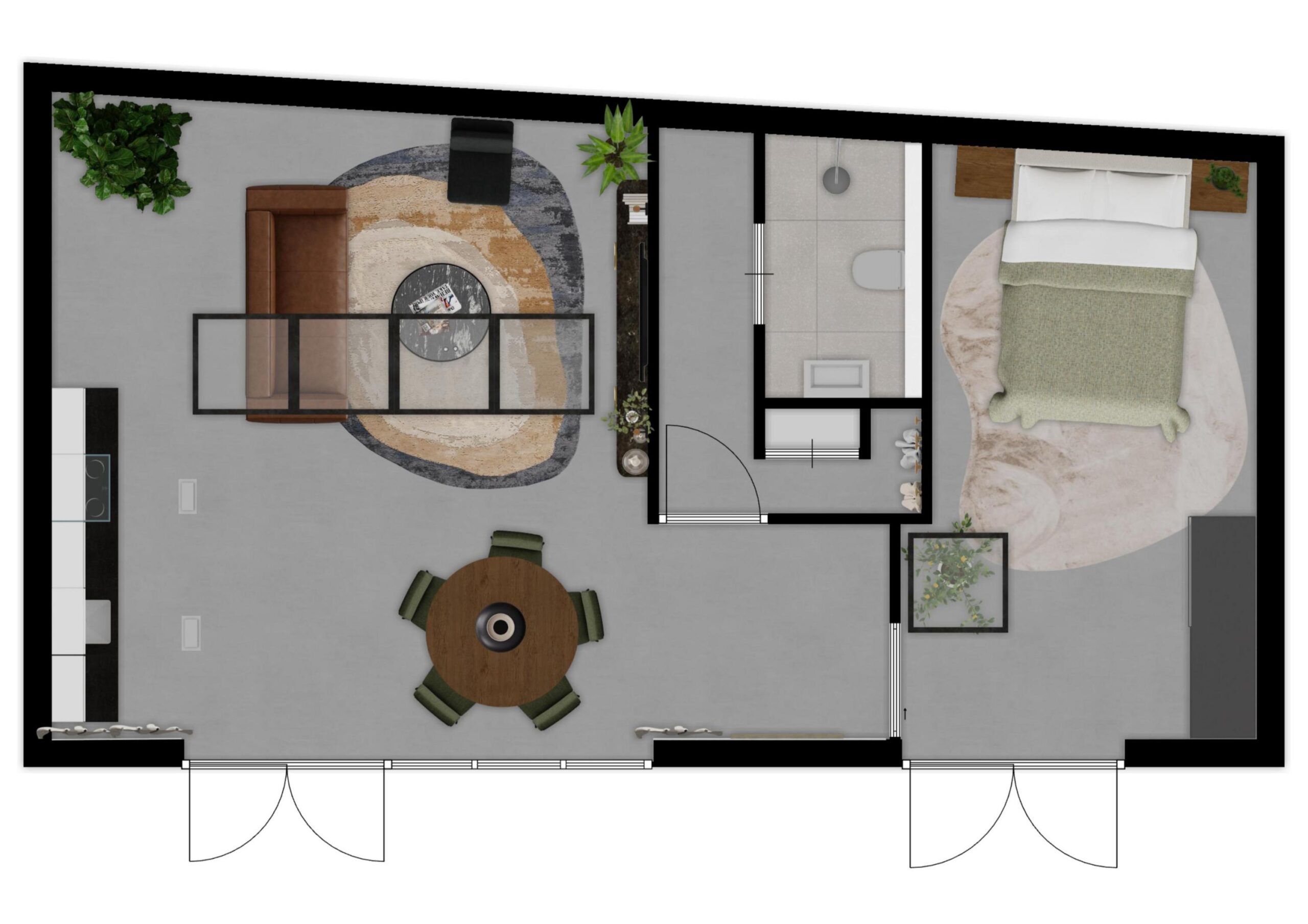 Een alternatieve plattegrond en digitale animatie in de woningpresentatie laten zien hoe eenvoudig deze ruimte is om te bouwen tot comfortabele mantelzorgwoning (vergunningplichtig).