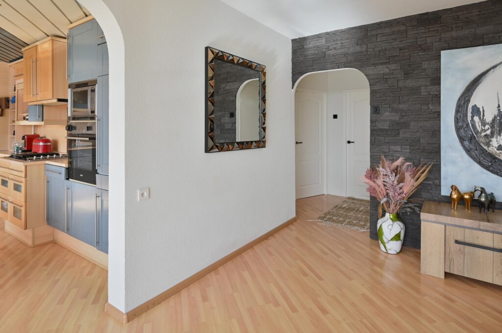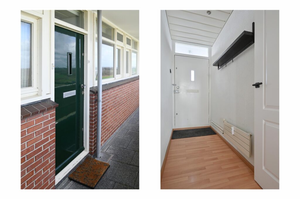 Entree, gang met aansluitend de hal met meterkast. Lichte woonkamer met deur naar balkon op het zuiden. Open woonkeuken voorzien van diverse inbouwapparatuur waaronder: een 5-pits Boretti fornuis met wokbrander, een vlakscherm afzuigkap, vaatwasser, magnetron, oven (2022) en koelkast met 3-ladenvriezer (2022). Vanuit de woonkamer en de keuken is het genieten van het fenomenale uitzicht op het Amsterdam Rijnkanaal.