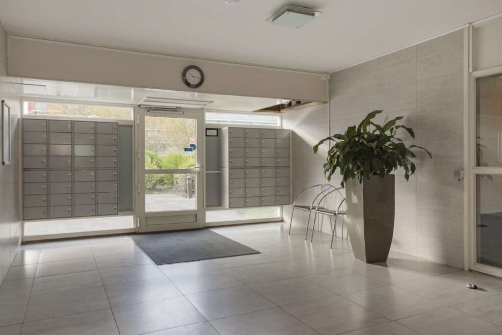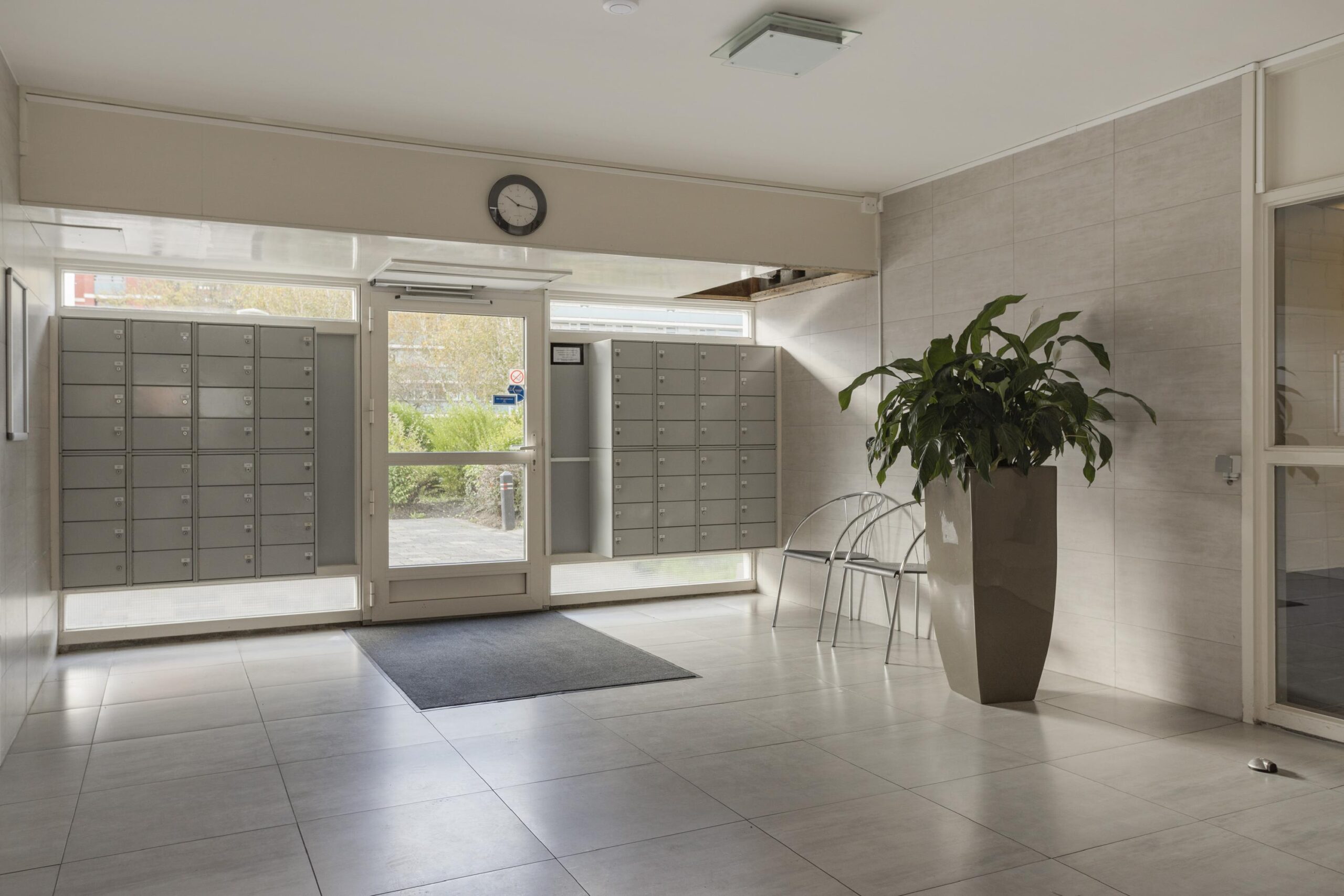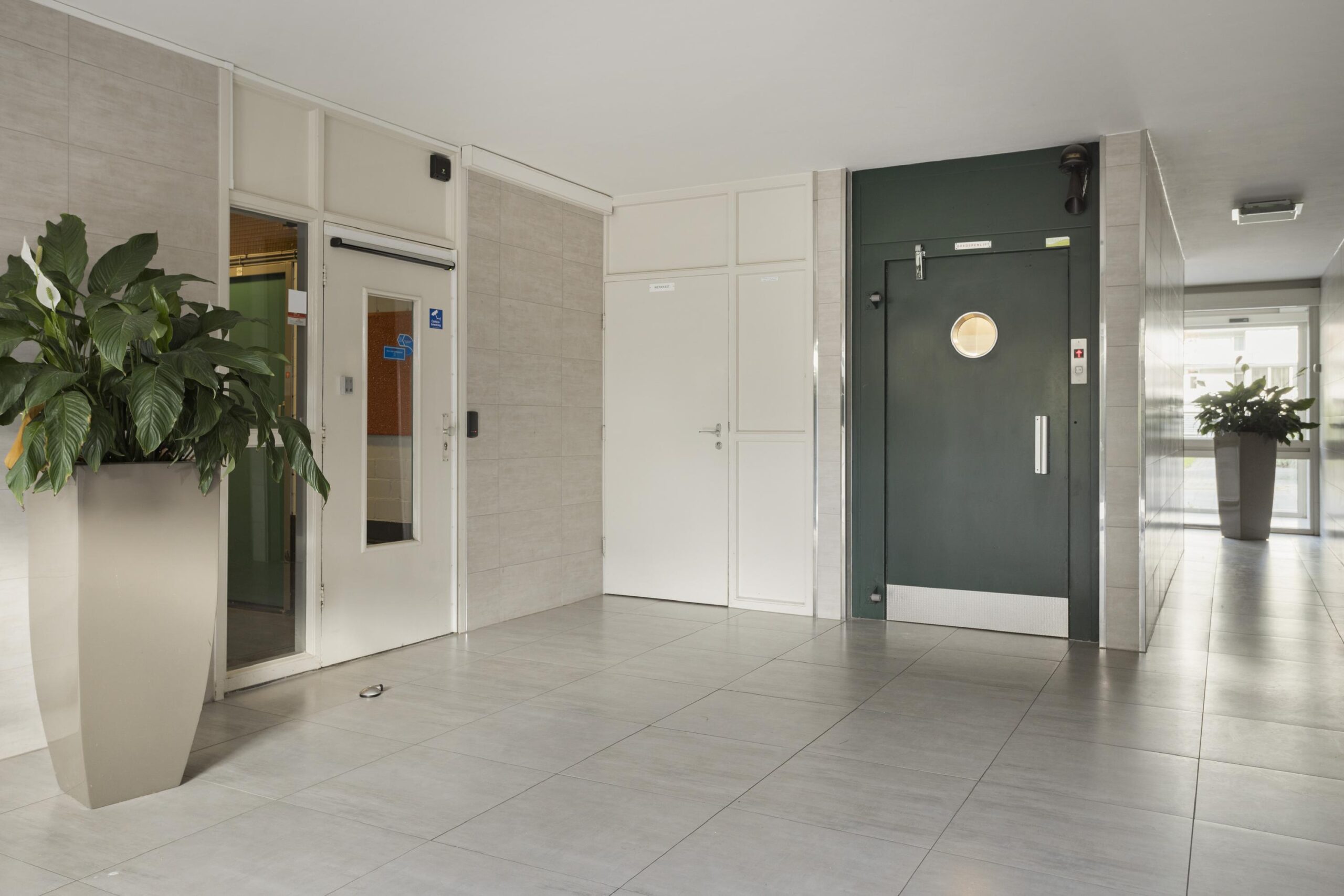 Gemoderniseerde centrale entree/tochtportaal met belinstallatie en intercom. Afgesloten hal met personen- en goederenlift, trappenhuis, postbussen en afgesloten deur naar bergingen.