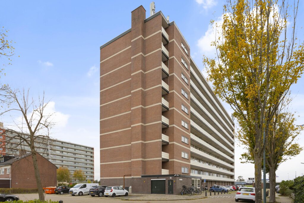 Het appartementengebouw telt totaal 9 woonlagen, een verzorgde entree met brievenbussen, bellenpaneel met intercom, afsluitbare centrale hal met liftinstallatie en trappenhuis. In de onderbouw bevindt zich de afgesloten berging (ca 7m²) met raam. Parkeren kan op openbaar terrein voor het appartementencomplex. Hier bevinden zich ook de ondergrondse afvalcontainers.