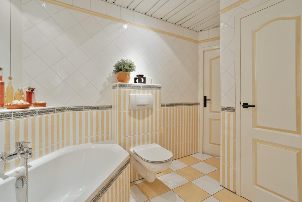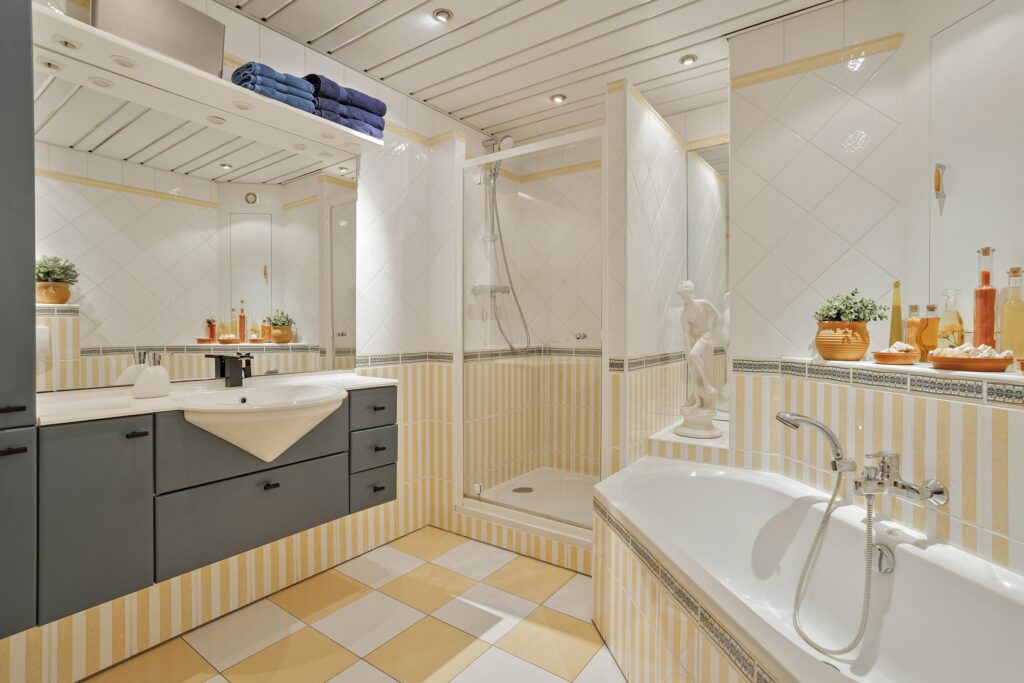 De zeer ruime badkamer is van alle gemakken voorzien. Een ligbad, douche, zwevend toilet, riant wastafelmeubel en een nis waarin de wasmachine en- droger kunnen worden geplaatst. De badkamer wordt mechanisch geventileerd.